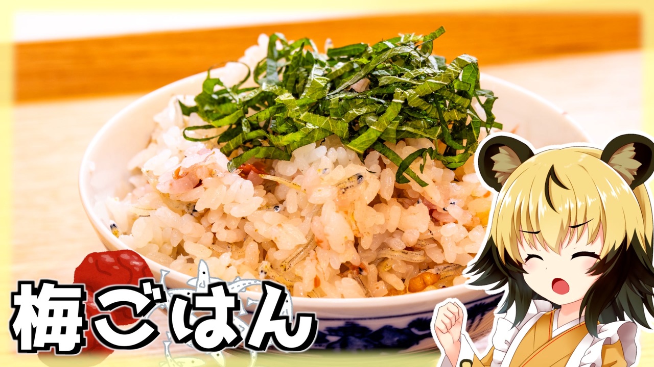 暑くて食欲が落ちてしまう、そんな時はございませんか?<br>そんな時にも簡単に作れて、しかも疲労回復にも良い神奈川県小田原市の郷土料理?「梅ごはん」を作っていきましょう。<br><br>材料からもとっても馴染み深いレシピだと思います。<br>似た材料のおにぎりがコンビニでも見られます。<br>でも、ちょっとだけ作り方が違うとより出汁の風味が感じられるレシピになっていると思いますよ。<br><br><br>食欲が落ちた時、疲れた時、<br>それから暑い時期のお弁当にいかがでしょう!<br><br><br>■材料<br>・米 2合(300g)<br>・梅干し お好みの量(おおよそ40g)<br>・ちりめんじゃこ お好みの量<br>・酒 大さじ1.5<br>・みりん 大さじ1.5<br>・だし汁 440g<br> ※白だしを使う場合、水420g+白だし大さじ2<br><br><br>■所要時間<br>作業時間:180分程度<br> (浸漬120分+炊飯40分+蒸らし20分)<br><br><br>youtube:<a href="https://youtu.be/7xHkve6aMhs" target="_blank" rel="noopener nofollow">https://youtu.be/7xHkve6aMhs</a><br>twitter:@lycaon_kitchen<br><br>りおんの和風喫茶:<a href="https://www.nicovideo.jp/series/77190" target="_blank" rel="noopener">series/77190</a><br>おつかれごはん:<a href="https://www.nicovideo.jp/series/155690" target="_blank" rel="noopener">series/155690</a><br>手作り和菓子でちょっとひとやすみしませんか?:<a href="https://www.nicovideo.jp/series/155691" target="_blank" rel="noopener">series/155691</a><br><br>立ち絵:星華 彩二魔 様<br>イラスト:AWD kitchen<br>音源:DOVA-SYNDROME<br>音声:AI.VOICE 紲星あかり+ exVOICE