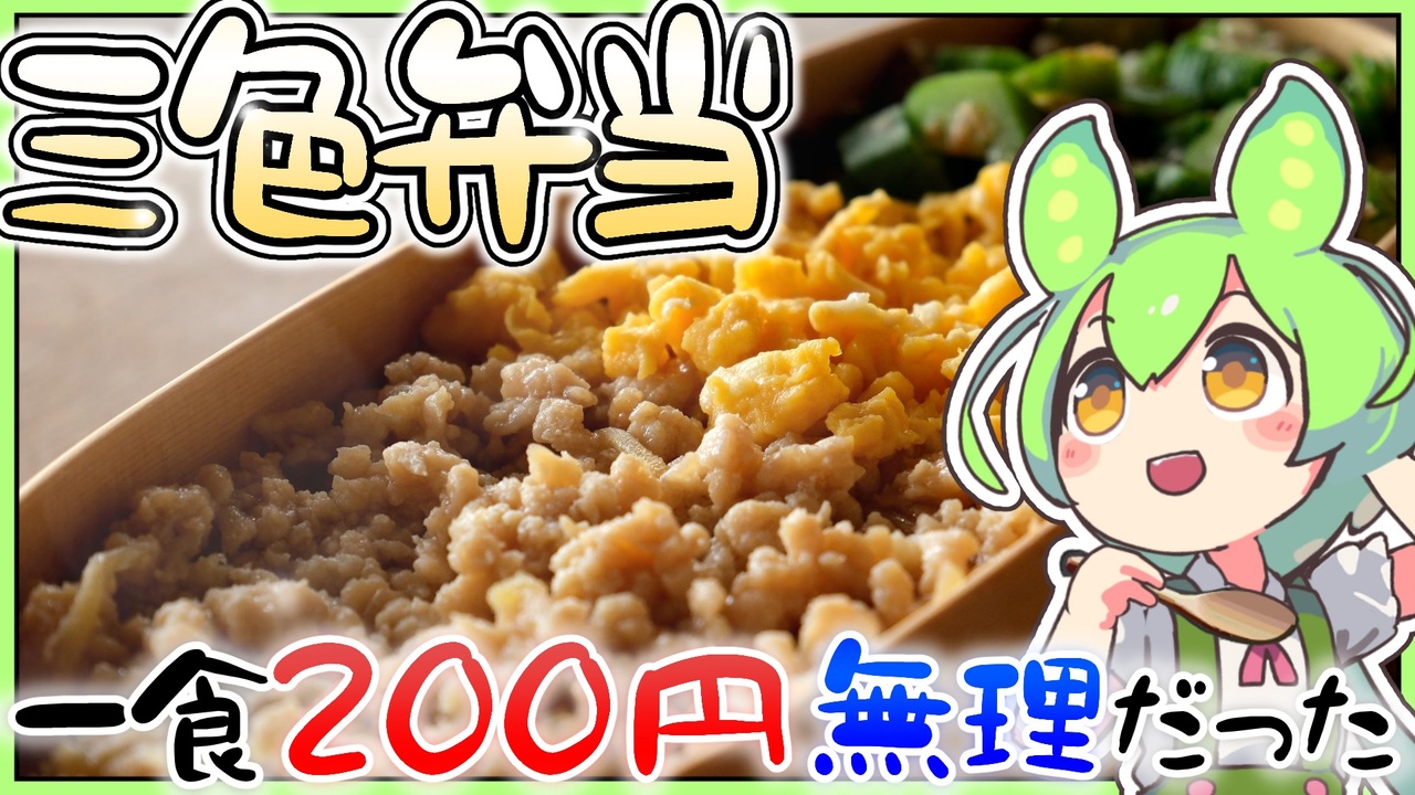 誤字脱字があります。<br>ごめんなさい。。。<br>ずんだもん達がショートアニメ風にゆっくり料理実況する動画です!<br>今回のテーマは三色そぼろ弁当!<br><br>できるだけ安く作りたかったのですが、鶏ひき肉がやや高かったです…<br>ですが、適当に作っても見栄えが良く、そしておいしいお弁当となりました。<br><br>たくさん作っても困ることがないので、是非お試しください!<br><br>登録者1000人記念の支援絵や挿絵はfumiさん<br><a href="https://twitter.com/fumikaka23" target="_blank" rel="noopener nofollow">https://twitter.com/fumikaka23</a><br><br><br>木工職人として曲物お弁当箱を作っています。<br>【木工弁当】きの 販売サイト<br><a href="https://kinobento.base.shop/" target="_blank" rel="noopener nofollow">https://kinobento.base.shop/</a><br><br>※ライセンス契約をしていないため、販売サイトへの誘導は概要欄からのみになります。<br>東北ずん子・ずんだもんプロジェクト公式様より、<br>今の動画スタイルや販売方法であれば、<br>ライセンス契約不要と許可を得ました。<br><br><br><a href="#" class="seekTime" data-seekTime="00:00" onclick="seekNicoPlayer('#00:00'); return false;">#00:00</a>オープニング <br><a href="#" class="seekTime" data-seekTime="01:52" onclick="seekNicoPlayer('#01:52'); return false;">#01:52</a>このチャンネルについて<br><a href="#" class="seekTime" data-seekTime="02:05" onclick="seekNicoPlayer('#02:05'); return false;">#02:05</a>おかず作り<br><a href="#" class="seekTime" data-seekTime="06:02" onclick="seekNicoPlayer('#06:02'); return false;">#06:02</a>お弁当箱に盛り付け<br><a href="#" class="seekTime" data-seekTime="08:19" onclick="seekNicoPlayer('#08:19'); return false;">#08:19</a>実食<br><a href="#" class="seekTime" data-seekTime="10:05" onclick="seekNicoPlayer('#10:05'); return false;">#10:05</a>まとめ<br><a href="#" class="seekTime" data-seekTime="11:39" onclick="seekNicoPlayer('#11:39'); return false;">#11:39</a>おまけ<br><br>[お借りした素材です]<br> ・いやすとや様 <a href="https://www.irasutoya.com/" target="_blank" rel="noopener nofollow">https://www.irasutoya.com/</a> <br>・みんちりえ様 <a href="https://min-chi.material.jp" target="_blank" rel="noopener nofollow">https://min-chi.material.jp</a><br>・AIPCT様 <a href="https://aipict.com/zh/top-chinese/" target="_blank" rel="noopener nofollow">https://aipict.com/zh/top-chinese/</a><br>・ChatGPT DALL•E3様 <a href="https://openai.com/dall-e-3" target="_blank" rel="noopener nofollow">https://openai.com/dall-e-3</a><br>・telopict様 <a href="https://telopict.com" target="_blank" rel="noopener nofollow">https://telopict.com</a><br>・効果音ラボ様 <a href="https://soundeffect-lab.info/" target="_blank" rel="noopener nofollow">https://soundeffect-lab.info/</a> <br>・DOVA-SYNDROME様 <a href="https://dova-s.jp" target="_blank" rel="noopener nofollow">https://dova-s.jp</a> <br>・四郎田中39様 <a href="https://www.nicovideo.jp/user/127603529?ref=videowatch_creatorinfo_user" target="_blank" rel="noopener nofollow">https://www.nicovideo.jp/user/127603529?ref=videowatch_creatorinfo_user</a><br>・坂本アヒル様 <a href="https://www.nicovideo.jp/user/97452727" target="_blank" rel="noopener nofollow">https://www.nicovideo.jp/user/97452727</a> <br>・Voicepeak様 <a href="https://www.ah-soft.com/voice/6nare/" target="_blank" rel="noopener nofollow">https://www.ah-soft.com/voice/6nare/</a> <br>ずんだもん 東北きりたん