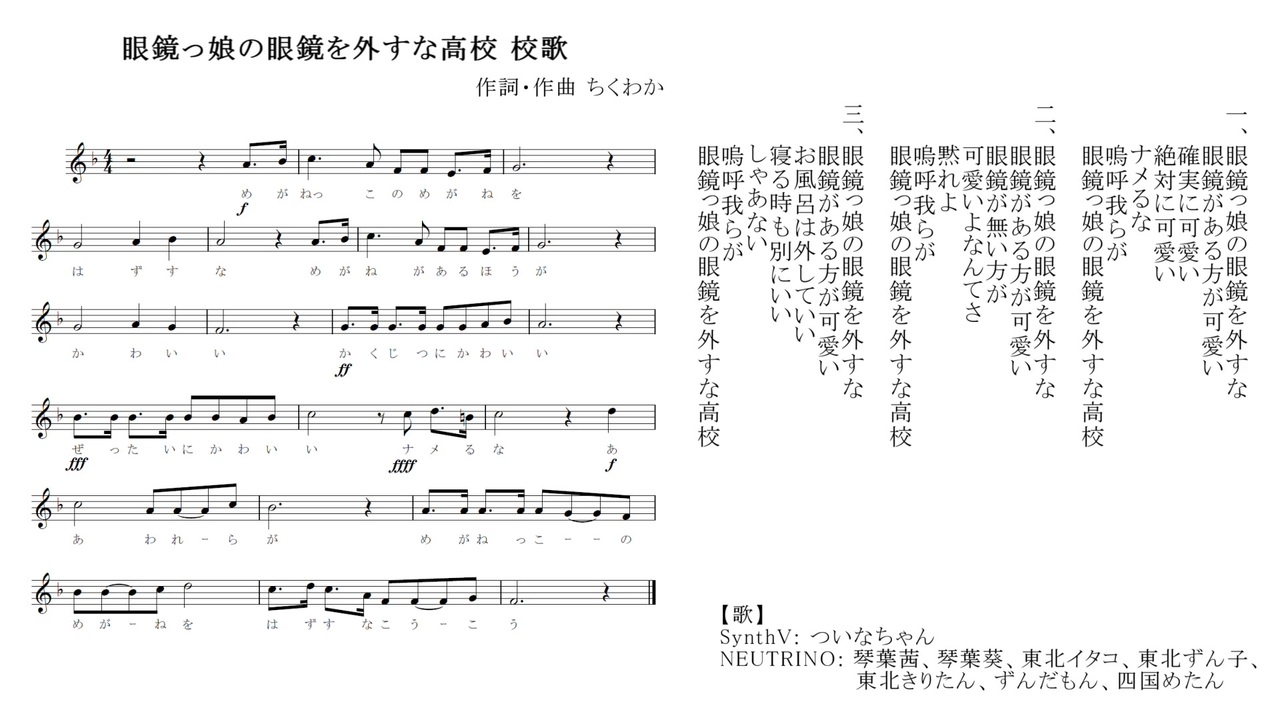 ほぼ初作曲でピアノも弾けないのに頑張って打ち込んだので初投稿です<br><br><br>【作詞・作曲】<br>俺<br><br>【歌】<br>Synthesizer V: ついなちゃん<br>NEUTRINO: 琴葉茜、琴葉葵、東北イタコ、東北ずん子、東北きりたん、ずんだもん、四国めたん<br><br><br><br><span style="font-size: 10px;"><u>3/13追記 高音質対応したとのことでせっかくだから上書き修正で音声ビットレート320kbpsにしました。最高音質化のやり方勉強しないとな…</u></span><br />--- 以下共通説明文 ---<br><br><br><span style="color: #ff0000; font-size: 18px;"><strong>ちくわかさんのSUZURIストア開設!!!</strong></span><br>以下URLから是非チェックしてください!!!<br><a href="https://suzuri.jp/tkwk_3" target="_blank" rel="noopener nofollow">https://suzuri.jp/tkwk_3</a><br><br><br><strong>NicoFTのパートナーパス販売開始しました!</strong><br><a href="https://nicoft.io/users/tkwk_3" target="_blank" rel="noopener nofollow">https://nicoft.io/users/tkwk_3</a><br><br>X(Twitter) → <a href="https://twitter.com/tkwk_3" target="_blank" rel="noopener nofollow">https://twitter.com/tkwk_3</a><br><br><br>飯作って食べるでシリーズ→ <a href="https://www.nicovideo.jp/series/279573" target="_blank" rel="noopener nofollow">https://www.nicovideo.jp/series/279573</a><br>企画参加等の料理単発系→ <a href="https://www.nicovideo.jp/series/284572" target="_blank" rel="noopener nofollow">https://www.nicovideo.jp/series/284572</a><br>あもあす動画 → <a href="https://www.nicovideo.jp/series/318162" target="_blank" rel="noopener nofollow">https://www.nicovideo.jp/series/318162</a><br>料理以外の動画→ <a href="https://www.nicovideo.jp/series/309010" target="_blank" rel="noopener nofollow">https://www.nicovideo.jp/series/309010</a><br><br><br>【コンテンツツリー外の素材サイト】<br>MusMus 様 → <a href="https://musmus.main.jp" target="_blank" rel="noopener nofollow">https://musmus.main.jp</a><br>効果音ラボ 様 → <a href="https://soundeffect-lab.info" target="_blank" rel="noopener nofollow">https://soundeffect-lab.info</a><br>いらすとや 様 → <a href="https://www.irasutoya.com/" target="_blank" rel="noopener nofollow">https://www.irasutoya.com/</a><br><br><a target="_blank" href="https://qa.nicovideo.jp/faq/show/19424?site_domain=default" style="font-size: 13px;color: #657586; text-decoration: underline; line-height: 1.4">この動画は投稿者によって修正されました</a>