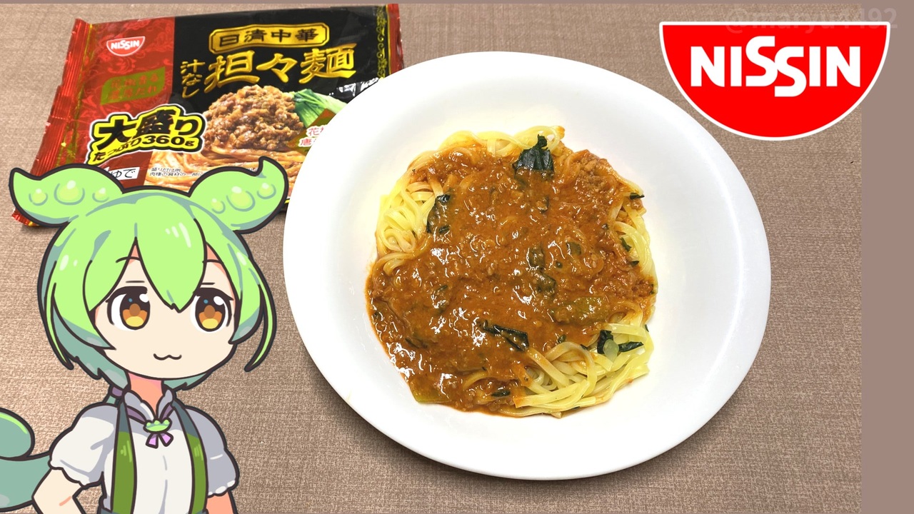 以前、トップバリュの冷凍汁なし担々麺を動画にしたのですが味はいまひとつ。<br>「日清の汁なし担々麺はおいしいですよ~」<br>と、コメントをいただいたので今回は日清を食べてみようと思います。<br><br><br>【関連動画】<br>トップバリュの黄色いヤツ「麻辣2種類の辛さ楽しむ 汁なし担々麺」<br><a href="https://www.nicovideo.jp/watch/sm43784405" target="_blank" rel="noopener nofollow">https://www.nicovideo.jp/watch/sm43784405</a><br><br>【参考】<br>冷凍 日清中華 汁なし担々麺 大盛り(日清食品)<br><a href="https://www.nissin.com/jp/products/items/11753" target="_blank" rel="noopener nofollow">https://www.nissin.com/jp/products/items/11753</a><br>「冷凍 日清中華 汁なし担々麺 大盛り 発売10周年限定品」(2023年9月1日発売)(日清食品)<br><a href="https://www.nissin.com/jp/news/11724" target="_blank" rel="noopener nofollow">https://www.nissin.com/jp/news/11724</a><br>麻辣2種類の辛さ楽しむ 汁なし担々麺(トップバリュ)<br><a href="https://www.topvalu.net/items/detail/4549414617535/" target="_blank" rel="noopener nofollow">https://www.topvalu.net/items/detail/4549414617535/</a><br>NISSINのロゴ、逆さに読んでも同じ 実は意図せずデザインしていた?2017.03.23(with news)<br><a href="https://withnews.jp/article/f0170323002qq000000000000000W00o10101qq000014922A" target="_blank" rel="noopener nofollow">https://withnews.jp/article/f0170323002qq000000000000000W00o10101qq000014922A</a><br><br>【使用した素材】(※敬称略)<br>(合成音声)VOICEVOX/ずんだもん/四国めたん<br><a href="https://voicevox.hiroshiba.jp/" target="_blank" rel="noopener nofollow">https://voicevox.hiroshiba.jp/</a><br>(立ち絵)坂本アヒル<br><a href="https://seiga.nicovideo.jp/seiga/im10788496" target="_blank" rel="noopener">im10788496</a>/<a href="https://seiga.nicovideo.jp/seiga/im10791276" target="_blank" rel="noopener">im10791276</a><br>(楽曲)甘茶の音楽工房/「楽しい麦畑」「フルーツパフェ」「お城の舞踏会」<br><a href="https://amachamusic.chagasi.com/" target="_blank" rel="noopener nofollow">https://amachamusic.chagasi.com/</a>