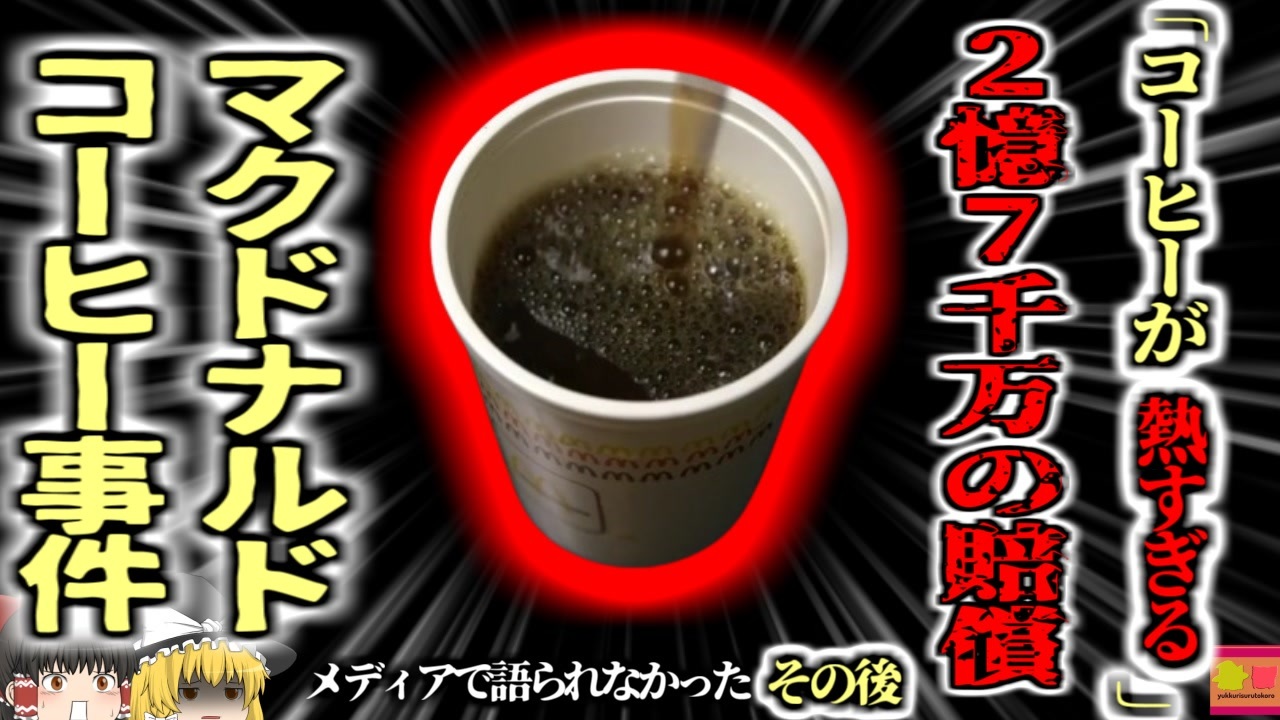 <a href="#" class="seekTime" data-seekTime="00:00" onclick="seekNicoPlayer('#00:00'); return false;">#00:00</a> OP<br><a href="#" class="seekTime" data-seekTime="00:15" onclick="seekNicoPlayer('#00:15'); return false;">#00:15</a> 報道による誤解<br><a href="#" class="seekTime" data-seekTime="00:41" onclick="seekNicoPlayer('#00:41'); return false;">#00:41</a> 本編開始<br><a href="#" class="seekTime" data-seekTime="1:17" onclick="seekNicoPlayer('#1:17'); return false;">#1:17</a> 孫と朝食を買いに出たAさん<br><a href="#" class="seekTime" data-seekTime="1:50" onclick="seekNicoPlayer('#1:50'); return false;">#1:50</a> ドリブスルーでホットコーヒー<br><a href="#" class="seekTime" data-seekTime="2:11" onclick="seekNicoPlayer('#2:11'); return false;">#2:11</a> うっかり落としてしまい・・・<br><a href="#" class="seekTime" data-seekTime="2:37" onclick="seekNicoPlayer('#2:37'); return false;">#2:37</a> 孫の処置後病院へ<br><a href="#" class="seekTime" data-seekTime="3:29" onclick="seekNicoPlayer('#3:29'); return false;">#3:29</a> 熱傷の診断<br><a href="#" class="seekTime" data-seekTime="4:28" onclick="seekNicoPlayer('#4:28'); return false;">#4:28</a> 一週間の入院と多額の治療費<br><a href="#" class="seekTime" data-seekTime="4:58" onclick="seekNicoPlayer('#4:58'); return false;">#4:58</a> 訴えを起こしたAさん<br><a href="#" class="seekTime" data-seekTime="5:56" onclick="seekNicoPlayer('#5:56'); return false;">#5:56</a> ホットコーヒーの温度<br><a href="#" class="seekTime" data-seekTime="6:41" onclick="seekNicoPlayer('#6:41'); return false;">#6:41</a> 裁判でのやり取り<br><a href="#" class="seekTime" data-seekTime="8:00" onclick="seekNicoPlayer('#8:00'); return false;">#8:00</a> 判決<br><a href="#" class="seekTime" data-seekTime="9:01" onclick="seekNicoPlayer('#9:01'); return false;">#9:01</a> 270万ドル(2億7000万円)<br><a href="#" class="seekTime" data-seekTime="9:20" onclick="seekNicoPlayer('#9:20'); return false;">#9:20</a> あっという間に全世界へ<br><a href="#" class="seekTime" data-seekTime="9:51" onclick="seekNicoPlayer('#9:51'); return false;">#9:51</a> 「嘘は言っていないが真実ではない報道」<br><a href="#" class="seekTime" data-seekTime="10:31" onclick="seekNicoPlayer('#10:31'); return false;">#10:31</a> 実際には5000万円で和解が成立<br><a href="#" class="seekTime" data-seekTime="11:31" onclick="seekNicoPlayer('#11:31'); return false;">#11:31</a> 現在のコーヒーの温度にも影響<br><a href="#" class="seekTime" data-seekTime="12:38" onclick="seekNicoPlayer('#12:38'); return false;">#12:38</a> 熱傷は最も身近な危険<br><a href="#" class="seekTime" data-seekTime="13:38" onclick="seekNicoPlayer('#13:38'); return false;">#13:38</a> 万が一の時の対処法<br><br><br><br>引用・出展・参考文献<br>日本創傷外科学会<br><a href="https://ishort.ink/sJhP" target="_blank" rel="noopener nofollow">https://ishort.ink/sJhP</a><br>Wikipedia<br><a href="https://ishort.ink/6Ntx" target="_blank" rel="noopener nofollow">https://ishort.ink/6Ntx</a><br><a href="https://ishort.ink/G4yd" target="_blank" rel="noopener nofollow">https://ishort.ink/G4yd</a><br><br><br />※この動画は過去の事件を知り、現在でも同じことが発生する危険性を再認識、関与しないように促すための動画であり、視聴者を扇動、動揺を誘うためのコンテンツではありません。<br><br>ご要望にお応えして、メンバーシップの開設を行いました。<br>下記URLからも登録可能ですので、ご興味がある方は是非ご参加ください。<br><a href="https://www.youtube.com/channel/UCcT5a1J7XJW7CLYI2RKl4pw/join" target="_blank" rel="noopener nofollow">https://www.youtube.com/channel/UCcT5a1J7XJW7CLYI2RKl4pw/join</a><br><br><br>Twitter<br>→<a href="https://twitter.com/yukkurisurutoko" target="_blank" rel="noopener nofollow">https://twitter.com/yukkurisurutoko</a><br><br>取り急ぎ、簡易的にですがマイリストを作りました。<br>【ゆっくり解説】事故・事件関係紹介リスト <br><a href="https://www.nicovideo.jp/mylist/71034319" target="_blank" rel="noopener nofollow">https://www.nicovideo.jp/mylist/71034319</a><br>【ゆっくり解説】放射線系事故<br><a href="https://www.nicovideo.jp/mylist/71034368" target="_blank" rel="noopener nofollow">https://www.nicovideo.jp/mylist/71034368</a><br>【ゆっくり解説】鉄道系事故・事件関連<br><a href="https://www.nicovideo.jp/mylist/71034379" target="_blank" rel="noopener nofollow">https://www.nicovideo.jp/mylist/71034379</a>