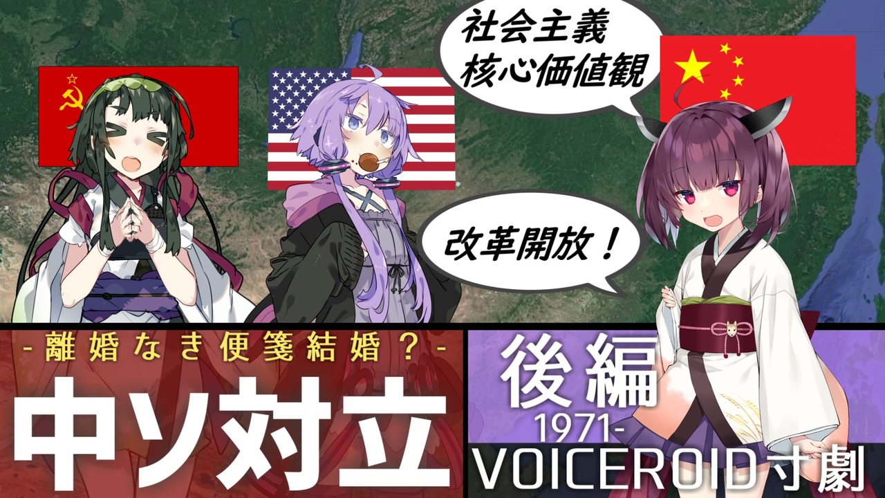 遅くなってしまい申し訳ございません。<br>最初はソ連崩壊の時点で終わらすつもりが、どうせならキリの良い所までやろうと思ったら中露関係まで作ってしまいました。投稿した翌日に中露が正式に同盟締結とかしないことを祈ります。<br>そして暫くは単発の動画を作る予定です...<br><br><strong>【主要参考文献】</strong><br>中ソ対立―その基盤・歴史・理論/菊地昌典,袴田茂樹,宍戸寛,矢吹晋(著)/有斐閣選書 (1976年4月30日)<br>アジア冷戦史/下斗米 伸夫(著)/中公新書 (2004年9月25日)<br>中国とソ連/毛里 和子(著)/岩波新書 (1989年5月22日)<br>ソビエト連邦史/下斗米 伸夫(著)/講談社 (2017年2月11日)<br>中華人民共和国史 新版/天児 慧(著)/岩波新書 (2013年8月22日)<br>戦後世界経済史: 自由と平等の視点から/猪木 武徳(著)/中公新書 (2009年5月1日)<br>他、日本や米国、社会主義陣営についての参考文献は動画最後に記載<br><br><strong>【動画内の配役】</strong><br>※立ち絵の制作者様に関しては動画最後に記載<br>ナレーション:琴葉葵:VOICEROID+EX<br>ソビエト連邦:東北ずん子:VOICEROID+EX<br>中華人民共和国:東北きりたん:VOICEROID+EX<br>中国国内の「修正主義者」:ずんだもん:VOICEVOX<br>朝鮮民主主義人民共和国:琴葉茜:VOICEROID+EX<br>アルバニア:小夜/SAYO : VOICEVOX<br>北ベトナム:中国うさぎ : VOICEVOX<br>東欧諸国:弦巻マキ:VOICEROID+EX<br>日本共産党:紲星あかり:VOICEROID2<br>アメリカ合衆国:結月ゆかり:VOICEROID2<br>中華民国:音街ウナ:VOICEROID2<br>日本国:紡乃世詞音:AI.VOICE<br><br><strong>【広告者様】</strong><br>有難いことに前編・中編共に多くの広告を頂き、動画説明欄に収まりきらなくなったので次回の動画にて前編・中編・後編纏めて紹介させていただきます。