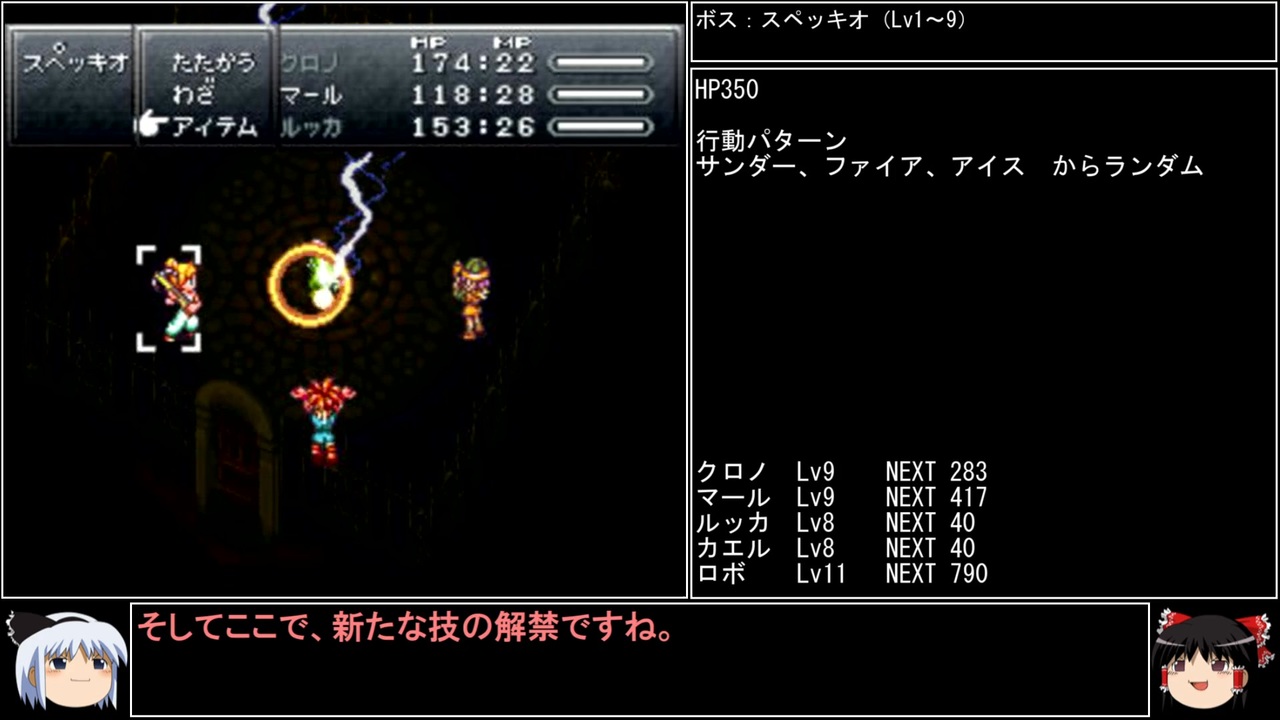 子供の頃、スペッキオの部屋を回るのにやたら苦戦した思い出がある不思議。<br>そして『愉快なスペッキオ』も、曲名の通り愉快な曲で元気が出ますね。<br><br>前→<a href="https://www.nicovideo.jp/watch/sm43809289" class="watch">sm43809289</a><br>次→<a href="https://www.nicovideo.jp/watch/sm43865122" class="watch">sm43865122</a><br><br>YouTube版→<a href="https://youtu.be/GKsUxOY5Onk" target="_blank" rel="noopener nofollow">https://youtu.be/GKsUxOY5Onk</a><br><br>縛りルール<br>①一度使った武器・防具・アクセサリー・道具・技・連携は<br> 次周回以降使用禁止(売却も解禁扱い)<br><br>②一度戦った敵シンボルとの再戦禁止。<br><br>③初戦闘の敵からの逃走禁止。<br><br>④裏技、バグ技、状況再現禁止。<br><br>⑤BS1アクティブからBS8ウェイトまで<br> 全てのバトルスピードとバトルモードで攻略する。<br><br>⑥各周回において見る予定のED条件を<br> 満たした段階で即ラヴォスと戦いに行く。<br><br>※ネタバレ注意です<br><br>このページ、動画で利用している弊社または弊社のライセンサーが権利を有する著作物の転載・配布は禁止いたします。<br>© 1995, 2018 SQUARE ENIX<br>Illustration: © 1995 BIRD STUDIO / SHUEISHA<br>Story and Screenplay: © 1995, 2008 ARMOR PROJECT / SQUARE ENIX<br><br>AquesTalk2ライセンスID:AQTK2WINUSR23122185<br /><br><br>❤いいねを押していただけるとモチベーションと投稿速度が上がるので宜しくお願い致します!<br><br>作者ツイッター→ <a href="https://twitter.com/nig0117" target="_blank" rel="noopener nofollow">https://twitter.com/nig0117</a><br>PIXIV FANBOX→ <a href="https://sutanokeiji.fanbox.cc/" target="_blank" rel="noopener nofollow">https://sutanokeiji.fanbox.cc/</a><br><br>( 以前はWEB小説書いてました→ <a href="https://kakuyomu.jp/works/1177354054884910267" target="_blank" rel="noopener nofollow">https://kakuyomu.jp/works/1177354054884910267</a> )