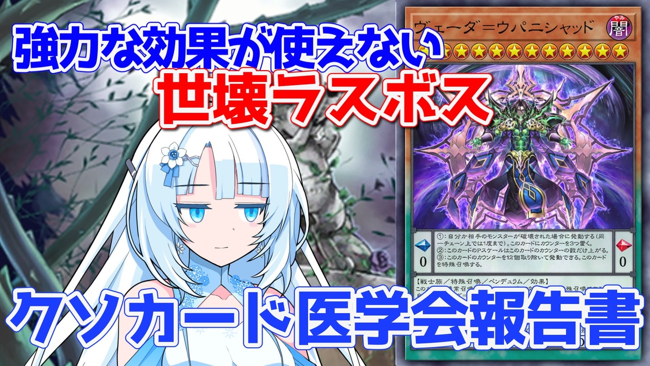 ヴェーダ=ウパニシャッドはもっと研究されるべきだと思いました<br><br>あまくだり氏リスペクトです<br>あまくだり氏本家様:<a href="https://www.nicovideo.jp/watch/sm39593211" target="_blank" rel="noopener nofollow">https://www.nicovideo.jp/watch/sm39593211</a><br><br>展開の訂正:ターンスキップ型にて医龍までの経路に手札からモンスターを使いましたが<br>ビヨンドとツイストコブラでセレーネをリンク召喚すれば4素材医龍につながります。多分。<br><br>【使用立ち絵】<br>・WhiteCUL立ち絵素材 / moiky さん<br><br>【使用音声】<br>・VOICEVOX WhiteCUL<br>VOICEVOX | 無料のテキスト読み上げソフトウェア <br><a href="https://voicevox.hiroshiba.jp/" target="_blank" rel="noopener nofollow">https://voicevox.hiroshiba.jp/</a><br><br>【使用BGM】<br>フリーBGM DOVA-SYNDROME<br>・Fancy Pop / 蒲鉾さちこ さん<br><br>【効果音】<br>効果音ラボ さん<br /><br>いつもいいね!コメント、広告ありがとうございます。<br>苦情等はこちらへ <a href="https://twitter.com/nyannayn5600" target="_blank" rel="noopener nofollow">https://twitter.com/nyannayn5600</a>