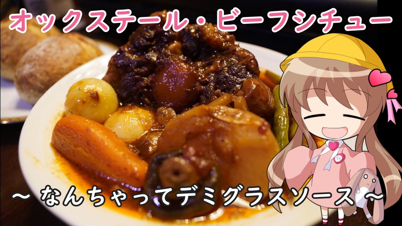 ソース・ドゥミ・グラスを簡略化したなんちゃってデミグラスソースを試している過程で、ビーフシチューを作ってみました。<br>そこそこ本格的なビーフシチューになったと思います。<br><br>本物のソース・ドゥミ・グラスを使ったハヤシライス → <a href="https://www.nicovideo.jp/watch/sm42199020" class="watch">sm42199020</a><br><br>(あと、こっそり缶詰アレンジ投稿祭にも参加させていただきます)<br><br>【材料】6人分<br>牛テール1.5kg<br>塩15g<br>黒コショウ適量<br>オリーブオイル少々<br>水100ml<br>バター20g<br>ベーコン100g<br>牛すじ肉200g<br>ミルポワ<br> タマネギ1個<br> ニンジン1本<br> セロリ半本<br> マッシュルーム1パック<br>強力粉大さじ2<br>ニンニク3片<br>塩適量<br>マデラ酒200ml ※無ければ赤ワインで代用<br>赤ワイン300ml<br>フォンドヴォー1缶<br>ホールトマト缶1缶<br>ローリエ2枚<br>乾燥ブーケガルニ1パック<br>タイム1枝<br>チキンスープの素1本<br>ダークチョコレート20g<br>トマトケチャップ大さじ3<br>ウスターソース大さじ1<br>オイスターソース大さじ1<br>醤油大さじ1<br>塩適量<br>コショウ適量<br>ニンジン1本<br>ジャガイモ2個<br>仕上げの野菜<br> 小タマネギ8個<br> マッシュルーム2パック<br> インゲン1パック<br> バター15g<br /><br>使い方がよくわかってないTwitter<br><a href="https://twitter.com/hebikun99" target="_blank" rel="noopener nofollow">https://twitter.com/hebikun99</a>