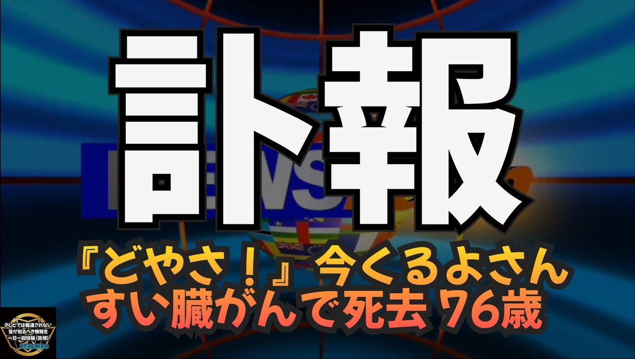 今くるよさん(76)死去 「どやさ」と叫ぶギャグで知られる NHKニュース 漫才コンビ「今いくよ・くるよ」で一世をふうびし、「どやさ」と叫ぶギャグで知られる今くるよさんがすい臓がんのため、27日、大阪市内の病院で亡くなりました。76歳でした。<br><br><br>漫才コンビ「今いくよ・くるよ」で一世をふうびし、「どやさ」と叫ぶギャグで知られる今くるよさんがすい臓がんのため、27日、大阪市内の病院で亡くなりました。<br><br>76歳でした。<br><br>今くるよさんは京都市出身で、昭和45年に漫才師の今喜多代さんに弟子入りし、その後、高校の同級生で同じソフトボール部だった今いくよさんと漫才コンビ「今いくよ・くるよ」を結成しました。<br><br>ふくよかな体型に派手な衣装のくるよさんと、細身の体型に濃いめのメークとつけまつげがトレードマークのいくよさんの軽妙なかけあいが人気を集め、1980年代の漫才ブームにものって一世をふうびしました。<br><br>中でもくるよさんがおなかをたたきながら「どやさ」と叫ぶ体をはったギャグは観客を笑わせました。<br><br><br>2人は昭和59年の上方漫才大賞の大賞をはじめ数々の賞を受賞したほか、女流漫才師のパイオニアとしてテレビやラジオ、舞台などで活躍し、長年にわたり幅広い人気を集めてきました。<br><br>相方のいくよさんは胃がんのため9年前に亡くなり、くるよさんはおととし(令和4年)大阪での公演に出演しましたが、その後体調を崩し、すい臓がんのため、27日に大阪市内の病院で亡くなりました。<br>76歳でした<br><br><br><br>ご冥福をお祈りします□<br><br><a href="http://totalnewsjp.com/2024/05/28/fuho-35/" target="_blank" rel="noopener nofollow">http://totalnewsjp.com/2024/05/28/fuho-35/</a><br><br><br><br>くるよ いきよくるよ どやさ 漫才 お笑い すい臓がん 訃報 早すぎる死 超過死亡 著名人の死 止まらない訃報 <br><br><br><br><br />著作権、肖像権に配慮して作成しております。<br><br>◆気になったニュースの台本!?<br>メモ代わりに作った台本をそのままあげてます<br><a href="https://keiichiro8140.hatenablog.com/." target="_blank" rel="noopener nofollow">https://keiichiro8140.hatenablog.com/.</a><br><br><br>ここからはシリーズ紹介<br><br><br>◆ ワクチン解毒・デトックス<br><a href="https://x.gd/fZweg" target="_blank" rel="noopener nofollow">https://x.gd/fZweg</a><br><br>◆ウイリアム・マキス博士のがん治療(イベルメクチン・フェンベンダゾール等)<br><a href="https://x.gd/AtFYS" target="_blank" rel="noopener nofollow">https://x.gd/AtFYS</a><br><br>◆予防接種健康被害救済制度<br><a href="https://x.gd/0xK9x" target="_blank" rel="noopener nofollow">https://x.gd/0xK9x</a><br><br>◆気になったニュース #1501~<br><br>◆ 【ショートver】気になったニュース<br><a href="https://x.gd/7MxXC" target="_blank" rel="noopener nofollow">https://x.gd/7MxXC</a><br><br>◆ 気になったニュース #1001~<br><a href="https://x.gd/Lp8gv" target="_blank" rel="noopener nofollow">https://x.gd/Lp8gv</a><br><br>◆ 気になったニュース #501~<br><a href="https://x.gd/EmbS4" target="_blank" rel="noopener nofollow">https://x.gd/EmbS4</a><br><br>◆ 気になったニュース #1~#500<br><a href="https://x.gd/uPhNb" target="_blank" rel="noopener nofollow">https://x.gd/uPhNb</a><br><br>◆ X(旧Twitter)・テレグラムで気になった情報<br><a href="https://x.gd/YG6FT" target="_blank" rel="noopener nofollow">https://x.gd/YG6FT</a><br><br>◆ 日比谷5万人パレードデ⚪生放送アーカイブ動画<br><a href="https://x.gd/3CHJv" target="_blank" rel="noopener nofollow">https://x.gd/3CHJv</a><br><br>◆日比谷5万人パレード⚪モのマイリスト作ってみました<br><a href="https://nico.ms/mylist/76828848?ref=sp_other" target="_blank" rel="noopener nofollow">https://nico.ms/mylist/76828848?ref=sp_other</a><br><br>◆3.30 令和の百姓⚪⚪<br><a href="https://www.nicovideo.jp/series/511791?ref=garage_share_other" target="_blank" rel="noopener nofollow">https://www.nicovideo.jp/series/511791?ref=garage_share_other</a><br><br>◆ 及川幸久さんの【XNEWS】シリーズ<br><a href="https://x.gd/3k78K" target="_blank" rel="noopener nofollow">https://x.gd/3k78K</a><br><br>◆これまでの動画<a href="https://x.gd/sPXoJ" target="_blank" rel="noopener nofollow">https://x.gd/sPXoJ</a><br><br>◆もしも(BAN)の時のためのマイリンク集<a href="https://lit.link/K-16_News44" target="_blank" rel="noopener nofollow">https://lit.link/K-16_News44</a><br><br>