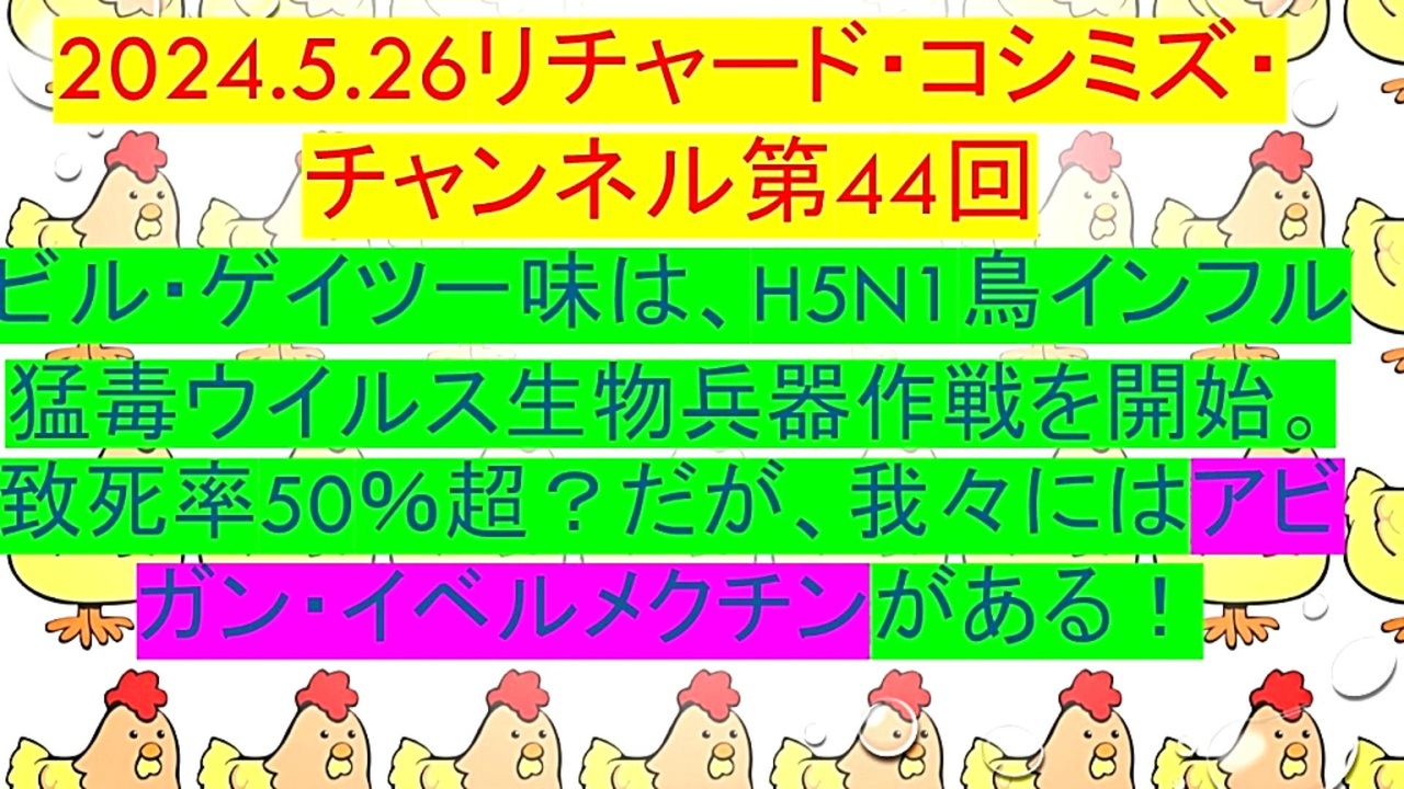 <span style="color: #ff0000;"><strong>「『 ビル・ゲイツ一味 』は、『 H5N1鳥インフル猛毒ウイルス生物兵器作戦 』を『 開始 』。<br> 『 致死率50%超? 』、だが、我々には『 アビガン 』・『 イベルメクチン 』がある! 」</strong></span><br><br><span style="color: #38761d;"><strong> ◐ リチャード・コシミズ・チャンネル⦅ ニコニコ チャンネル ⦆</strong></span><br> <span style="color: #0000ff;"><strong><a href="https://ch.nicovideo.jp/richardkoshimizu" target="_blank" rel="noopener nofollow">https://ch.nicovideo.jp/richardkoshimizu</a></strong></span><br><br><span style="color: #38761d;"><strong> ◐ リチャード・コシミズ『 ニコニコ生放送⦅ LIVE ⦆』</strong></span> <br> <span style="color: #0000ff;"><strong><a href="https://www.nicovideo.jp/user/120930363/live_programs" target="_blank" rel="noopener nofollow">https://www.nicovideo.jp/user/120930363/live_programs</a></strong></span><br><br><span style="color: #38761d;"><strong> ◐ リチャード・コシミズ『 Rumble 』公式 動画ギャラリー</strong></span><br> <span style="color: #0000ff;"><strong><a href="https://rumble.com/user/richardkoshimizu" target="_blank" rel="noopener nofollow">https://rumble.com/user/richardkoshimizu</a></strong></span><br><br><span style="color: #38761d;"><strong> ◐ リチャード・コシミズ『 ニコニコ動画⦅ 全動画 ⦆』公式 動画ギャラリー</strong></span><br> <span style="color: #0000ff;"><strong><a href="https://www.nicovideo.jp/user/121957117/video" target="_blank" rel="noopener nofollow">https://www.nicovideo.jp/user/121957117/video</a></strong></span><br> <br> <span style="color: #38761d;"><strong>◐ リチャード・コシミズ『 ニコニコ動画⦅ 333 ~ ⦆』公式 動画ギャラリー</strong></span><br> <span style="color: #0000ff;"><strong><a href="https://www.nicovideo.jp/user/121028600/video" target="_blank" rel="noopener nofollow">https://www.nicovideo.jp/user/121028600/video</a></strong></span><br><br>