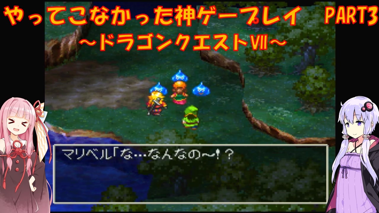 PS版 ドラゴンクエストⅦをプレイ<br>ゆかりさんはメジャーじゃないゲームをやる俺カッケー族だったのでドラクエをやったことがありませんでした(DSのⅤ以外)<br><br>茜:ついに戦闘キタコレ!<br>ゆ:謎解きばかりで頭が固まってたので脳が溶ける<br><br>PART1:<a href="https://www.nicovideo.jp/watch/sm43851863" target="_blank" rel="noopener nofollow">https://www.nicovideo.jp/watch/sm43851863</a><br><br>各DQシリーズ第1回リンク<br>DQ1 PART1:<a href="https://www.nicovideo.jp/watch/sm41819145" target="_blank" rel="noopener nofollow">https://www.nicovideo.jp/watch/sm41819145</a><br>DQ2 PART1:<a href="https://www.nicovideo.jp/watch/sm41895278" target="_blank" rel="noopener nofollow">https://www.nicovideo.jp/watch/sm41895278</a><br>DQ3 PART1:<a href="https://www.nicovideo.jp/watch/sm42034398" target="_blank" rel="noopener nofollow">https://www.nicovideo.jp/watch/sm42034398</a><br>DQ4 PART1:<a href="https://www.nicovideo.jp/watch/sm42520974" target="_blank" rel="noopener nofollow">https://www.nicovideo.jp/watch/sm42520974</a><br>DQ5 PART1:<a href="https://www.nicovideo.jp/watch/sm42848575" target="_blank" rel="noopener nofollow">https://www.nicovideo.jp/watch/sm42848575</a><br>DQ6 PART1:<a href="https://www.nicovideo.jp/watch/sm43080264" target="_blank" rel="noopener nofollow">https://www.nicovideo.jp/watch/sm43080264</a><br>DQM1 PART1:<a href="https://www.nicovideo.jp/watch/sm43525709" target="_blank" rel="noopener nofollow">https://www.nicovideo.jp/watch/sm43525709</a><br><br>動画内で使用させていただいた素材<br>【イラスト】<br>結月ゆかり→ペテン師様:<a href="https://seiga.nicovideo.jp/seiga/im5494168" target="_blank" rel="noopener nofollow">https://seiga.nicovideo.jp/seiga/im5494168</a><br>琴葉茜→ユメのオワリ様:<a href="https://seiga.nicovideo.jp/seiga/im10706241" target="_blank" rel="noopener nofollow">https://seiga.nicovideo.jp/seiga/im10706241</a><br><br>【音声】<br>A.I.Voice:琴葉茜<br><a href="https://aivoice.jp/product/kotonoha/" target="_blank" rel="noopener nofollow">https://aivoice.jp/product/kotonoha/</a><br><br>A.I.Voice:結月ゆかり<br><a href="https://aivoice.jp/product/yukari/" target="_blank" rel="noopener nofollow">https://aivoice.jp/product/yukari/</a><br><br>【その他素材】<br>効果音ラボ様:<a href="https://soundeffect-lab.info/" target="_blank" rel="noopener nofollow">https://soundeffect-lab.info/</a><br>いらすとや様:<a href="https://www.irasutoya.com/" target="_blank" rel="noopener nofollow">https://www.irasutoya.com/</a><br>等<br><br>この動画で利用している株式会社スクウェア・エニックスを代表とする共同著作者が権利を所有する著作物及びスギヤマ工房有限会社が権利を所有する楽曲の転載・配布は禁止いたします。<br>© 2000 ARMOR PROJECT/BIRD STUDIO/HEART BEAT/ARTEPIAZZA/SQUARE ENIX All Rights Reserved.<br>© SUGIYAMA KOBO