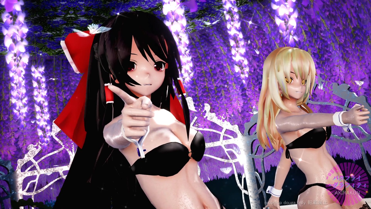 3人に踊ってもらいました。この作品は「東方project」の2次創作です。<br>現在、作成リクエストは受け付けていません。<br><br><br>【楽曲】:「バタフライ・グラフィティ」:八王子P 様 <a href="https://www.nicovideo.jp/watch/sm30990537" class="watch">sm30990537</a><br><br>【モーション】:breadtitor 様 <a href="https://www.nicovideo.jp/watch/sm33741946" class="watch">sm33741946</a><br><br>【リップ表情目線&カメラ】:ノン様 <a href="https://www.nicovideo.jp/watch/sm34200701" class="watch">sm34200701</a>(LipFaceMaker使用)<br><br><br>■スカイドーム<br>星空01_AL:ゆづき様<br>天の川02_AL:ゆづき様<br><br>■ステージ<br>藤ステージ:MIZU(みづ)様 <a href="https://seiga.nicovideo.jp/seiga/im10358130" target="_blank" rel="noopener">im10358130</a><br>st1_Butterfly:かのか様 <a href="https://seiga.nicovideo.jp/seiga/im4471787" target="_blank" rel="noopener">im4471787</a><br><br>■モデル<br>霊夢、魔理沙、アリス:にがもん様、しえら様<br>・衣装:アールビット様<br>はばたく蝶トンボ:hiro K 様 <a href="https://seiga.nicovideo.jp/seiga/im5379796" target="_blank" rel="noopener">im5379796</a><br><br>■エフェクト<br>Ray-mmd-1.5.2:Rui様<br>初心者マテリアル:さらしな様<br>肌マテリアル:MARUSU様<br>AutoLuminous4:そぼろ様<br>流体水面エフェクト:ビームマンP様<br>空中に漂う埃:化身バレッタ様<br>ikBokeh_v020a:ikeno様<br>Butterfly_改変_蝶:針金P 様、山田淀子様<br><br><br>MikuMikuDance:樋口優様<br>MMEffect :舞力介入P様<br>PMDE、PmxE:極北P様<br>AviUtl :KENくん様<br>Ut Video Codec suite:ゆーむP様<br>上海アリス幻楽団・東方project(ZUN様)<br><br>ゆうろえーす様x5、黒兄貴様、ねむ様、cz500c様、ゲルド様、runmania様、アルマク 鮎様x4、まさちち様、てくてく様x3、ゲルド様x5、cz500c様x2、またまたの広告ありがとうございます。(_ _)<br>ゆうろえーす様、アルマク 鮎様、多大な広告、@@・・フキフキ(= = )チャッ・・@@オォッ、ありがとうございます。(_ _)<br>ゆうろえーす様、ギフトありがとうございます。(_ _)<br><br>mylist ③<a href="https://www.nicovideo.jp/mylist/75586824" target="_blank" rel="noopener">mylist/75586824</a> ② <a href="https://www.nicovideo.jp/mylist/72970530" target="_blank" rel="noopener">mylist/72970530</a> ① <a href="https://www.nicovideo.jp/mylist/63690967" target="_blank" rel="noopener">mylist/63690967</a> 旧 <a href="https://www.nicovideo.jp/mylist/61238351" target="_blank" rel="noopener">mylist/61238351</a><br><br> ※動画の転載は禁止です。<br>Attention,Unauthorized reproduction prohibited!!