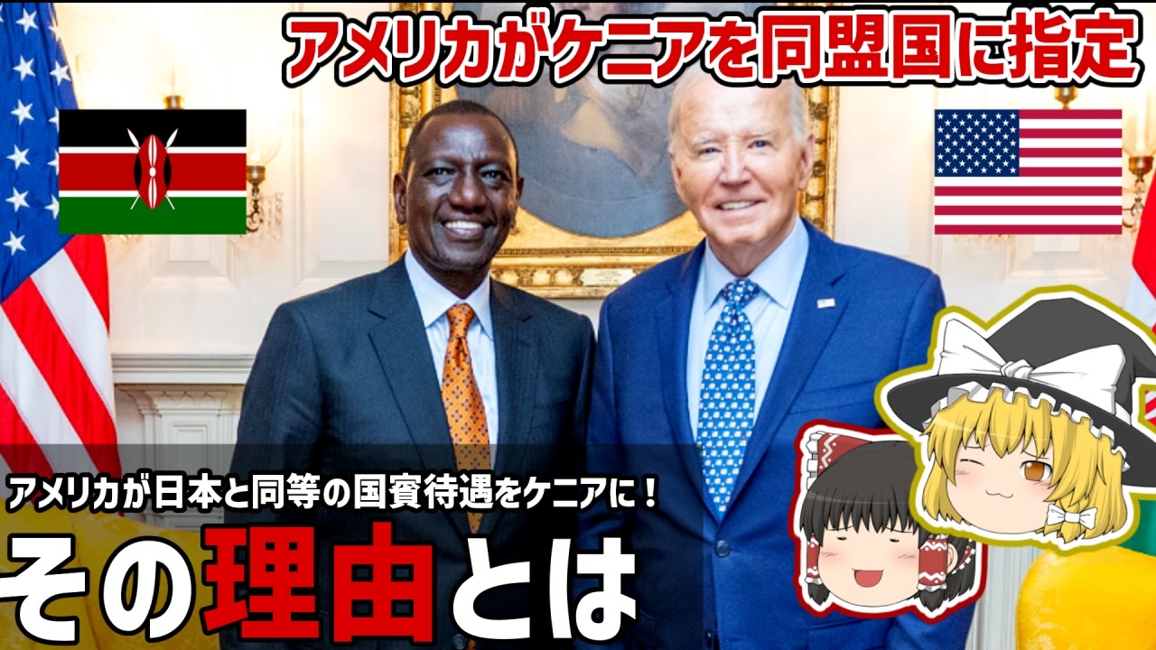 <span style="font-size: 16px;"><strong>タイトルですが正確にはサブサハラアフリカ初の主要同盟国です</strong></span><br><s>タイトル詐欺みたいになってるけど、伝わりにくいからね、仕方ないね。</s><br><br><span style="font-size: 16px;">先日、ケニアのルト大統領をアメリカのバイデン大統領が国賓として迎えいれました。<br>アフリカの首脳がアメリカに国賓として迎え入れられるのは、約15年ぶり。</span><br>日本の岸田首相が国賓として訪米したのは記憶に新しいですね。<br><br>またアメリカがNATO非加盟の同盟国としてケニアを指定するなど、<br>ケニアに対してとことん譲歩する姿勢を見せています。<br><br><span style="font-size: 18px;"><strong>というわけでいったいどうして<br>アメリカはケニアとの関係強化に乗り出したのか。<br>その理由を解説してみました。</strong></span><br><br><br>◆マイリスト→<a href="https://www.nicovideo.jp/mylist/73354161" target="_blank" rel="noopener nofollow">https://www.nicovideo.jp/mylist/73354161</a><br>◆アフリカの情報を上げてるうぷ主のTwitter→<a href="https://twitter.com/AfrikaanerMaris" target="_blank" rel="noopener nofollow">https://twitter.com/AfrikaanerMaris</a><br><br>いいねくれるとうれしいです<br>いっぱいコメントしてくれるとうぷ主が喜びます。<br>
