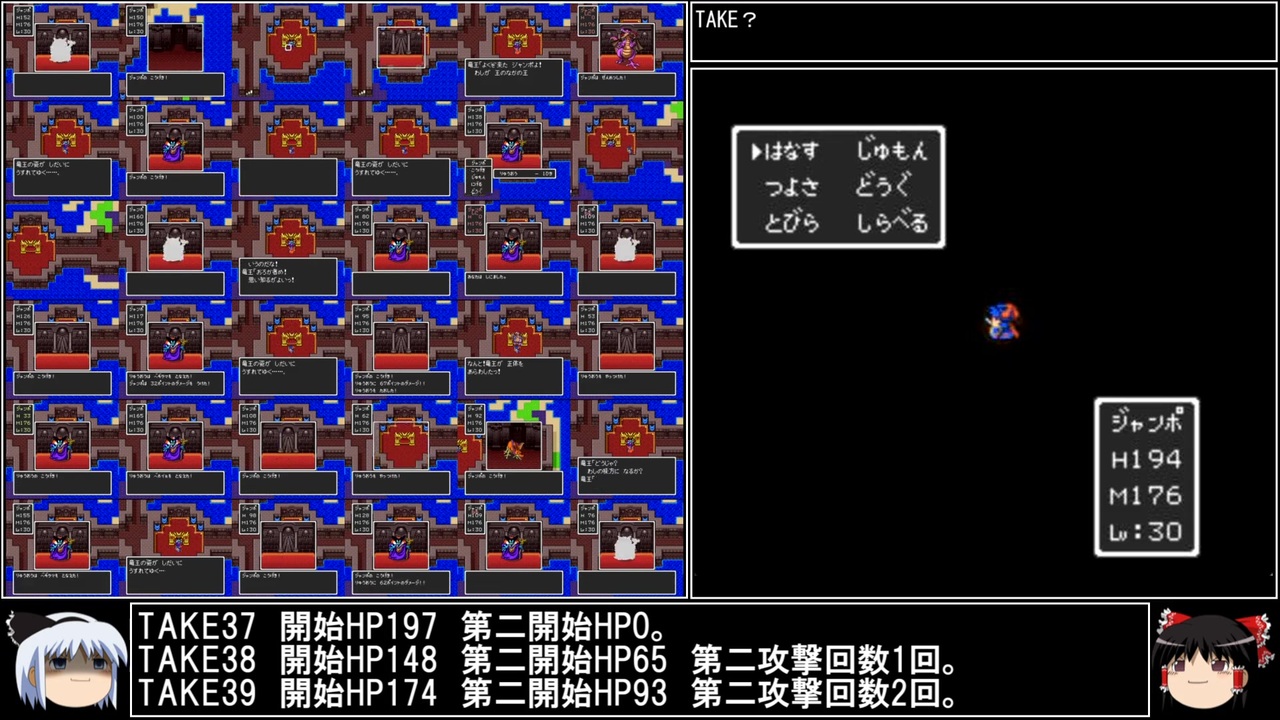 DQⅠの2周目、SFCDQⅠ編part3です。<br>レース風の編集をしている時は、まだ余裕がある時なんですよね。<br>だって9~16分割程度で済んでるってことだから……。<br><br>前→<a href="https://www.nicovideo.jp/watch/sm43873102" class="watch">sm43873102</a><br>次→<a href="https://www.nicovideo.jp/watch/sm43904650" class="watch">sm43904650</a><br><br>YouTube版→<a href="https://youtu.be/hYvCIm7VFIM" target="_blank" rel="noopener nofollow">https://youtu.be/hYvCIm7VFIM</a><br><br>縛りルール(詳細はpart1参照)<br>①一度使った武器・防具・装飾品・道具・呪文・特技は<br> 次作品以降使用禁止。(売却も解禁扱い)<br><br> 一度使った職業(3,6,7)・仲間モンスター(5,6)・スカウトモンスター(8)は<br> 戦士(Ⅲ)、戦士(Ⅵ)のようにナンバリングで分類し次作品以降使用禁止。<br> また複数体加入できる仲間モンスターは一体まで。<br><br>②裏技、バグ技、全滅、逃走、おどかす禁止。<br> またダンジョン攻略とボス戦における状況再現禁止。<br><br>③ダンジョンとボス攻略は、全キャラのレベルを突入時、<br> 1周目は目標レベル+5。2周目は+10。3周目は+15まで。<br> ラスボスの目標レベルは45。裏ボスは50とする。<br>(目標レベルは各公式ガイドブックを参照)<br><br>④1周目はEDまで。2周目は裏ボス撃破まで。<br> 3周目は全てのボスを規定回数、規定ターン以内に倒す。<br>(回避可能なボスも倒し、闇ゾーマは3周全てで倒す)<br><br><br><span style="color: #262626;">※一部機種は互換機を使用してのプレイとなりますが、倍速機能やクイックセーブ・ロード、チートなどは一切使用しません。</span><br><br>※ネタバレ注意です<br><br>この動画で利用している株式会社スクウェア・エニックスを代表とする共同著作者が権利を所有する著作物及びスギヤマ工房有限会社が権利を所有する楽曲の転載・配布は禁止いたします。<br>(C) ARMOR PROJECT/BIRD STUDIO/SQUARE ENIX All Rights Reserved.<br>(C) SUGIYAMA KOBO (P) SUGIYAMA KOBO<br><br>AquesTalk2ライセンスID:AQTK2WINUSR23122185<br /><br><br>❤いいねを押していただけるとモチベーションと投稿速度が上がるので宜しくお願い致します!<br><br>作者ツイッター→ <a href="https://twitter.com/nig0117" target="_blank" rel="noopener nofollow">https://twitter.com/nig0117</a><br>PIXIV FANBOX→ <a href="https://sutanokeiji.fanbox.cc/" target="_blank" rel="noopener nofollow">https://sutanokeiji.fanbox.cc/</a><br><br>( 以前はWEB小説書いてました→ <a href="https://kakuyomu.jp/works/1177354054884910267" target="_blank" rel="noopener nofollow">https://kakuyomu.jp/works/1177354054884910267</a> )