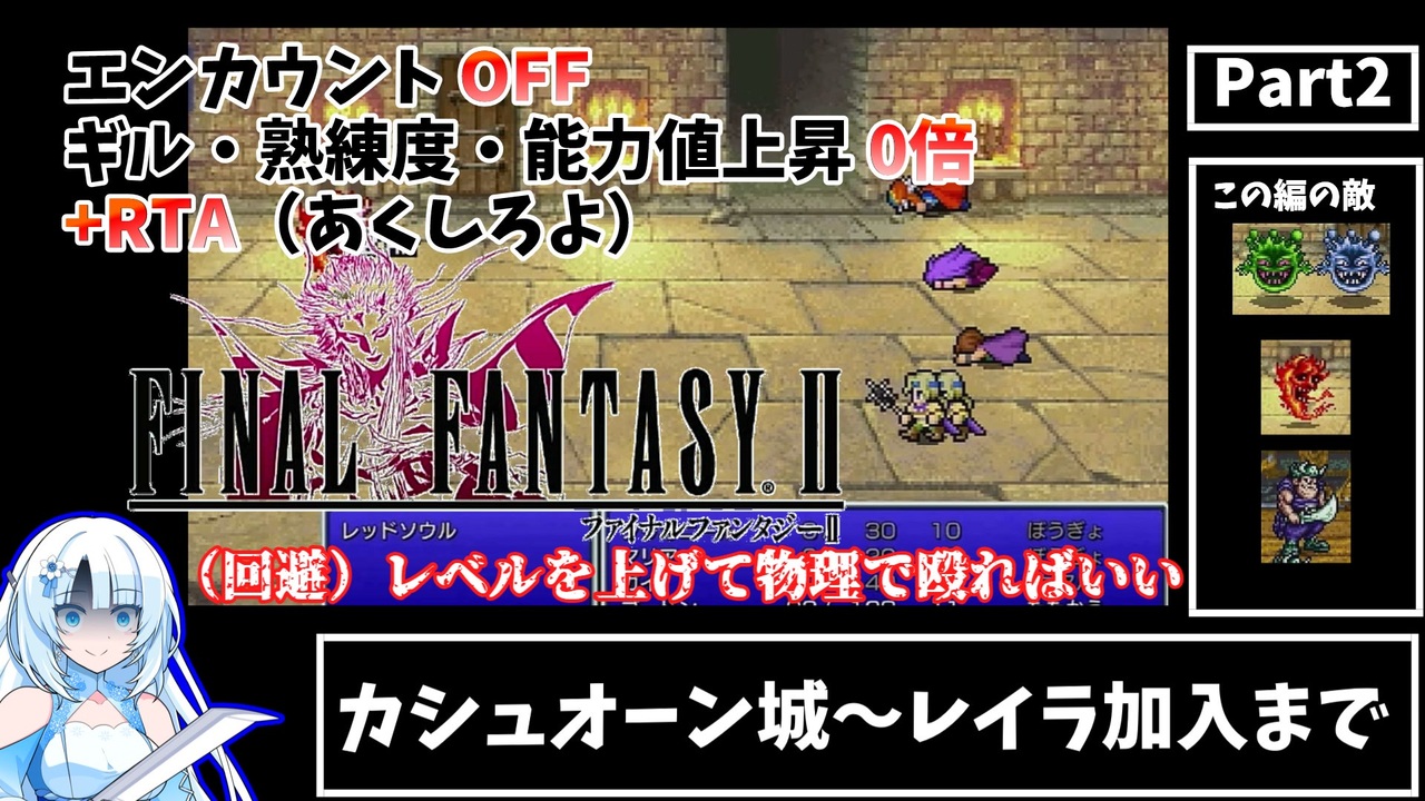 ピクセルリマスター版FF2(Switch版)を以下の条件でRTAしました。<br>はくさい氏の追走です。こちらを履修してからのご視聴をお勧め致します。→<a href="https://www.nicovideo.jp/series/459507" target="_blank" rel="noopener">series/459507</a><br><br>・ブースト機能をクリアまで下記で固定する<br> ・エンカウント:OFF<br> ・獲得ギル:0倍<br> ・武器熟練度アップ:0倍<br> ・魔法熟練度アップ:0倍<br> ・能力値アップ:0倍<br> ・HPアップ補正:OFF<br>・そのうえであくする<br>・道具・魔法・行動等は何を使ってもよい<br>・計測区間は名前決定時からラスボス撃破まで<br>・苦行はしない<br><br>並行しているFF2アイテム完全縛りも宜しくお願い致します。→<a href="https://www.nicovideo.jp/series/474323" target="_blank" rel="noopener">series/474323</a><br><br>VOICEVOX:WhiteCUL<br><br>参考サイト……<br>ファイナルファンタジー用語辞典:<a href="https://wikiwiki.jp/ffdic" target="_blank" rel="noopener nofollow">https://wikiwiki.jp/ffdic</a><br>GCGX(ゲーム攻略・解析&ホームページ作成):<a href="https://gcgx.games/" target="_blank" rel="noopener nofollow">https://gcgx.games/</a><br>FF2よ永遠なれ:<a href="https://surume5.han-be.com/Home/FF2/index.htm" target="_blank" rel="noopener nofollow">https://surume5.han-be.com/Home/FF2/index.htm</a><br>Gamer Corner Guides:<a href="https://guides.gamercorner.net/" target="_blank" rel="noopener nofollow">https://guides.gamercorner.net/</a><br>はたぼーの部屋:<a href="https://hboh2511.web.fc2.com/" target="_blank" rel="noopener nofollow">https://hboh2511.web.fc2.com/</a><br>cheapなゲーム攻略情報:<a href="http://www.ric.hi-ho.ne.jp/cheap_restaurant/GAME/" target="_blank" rel="noopener nofollow">http://www.ric.hi-ho.ne.jp/cheap_restaurant/GAME/</a><br>まるで成長しないFF2_RTA エンカOFF・ギル/熟練度/能力値0倍縛り:<a href="https://www.nicovideo.jp/series/459507" target="_blank" rel="noopener">series/459507</a><br><br>Part1→<a href="https://www.nicovideo.jp/watch/sm43815778" class="watch">sm43815778</a> Part3→<a href="https://www.nicovideo.jp/watch/sm43975199" class="watch">sm43975199</a><br><br>© SQUARE ENIX<br>LOGO ILLUSTRATION:© YOSHITAKA AMANO<br>「記載されている会社名・製品名・システム名などは、各社の商標、または登録商標です。」