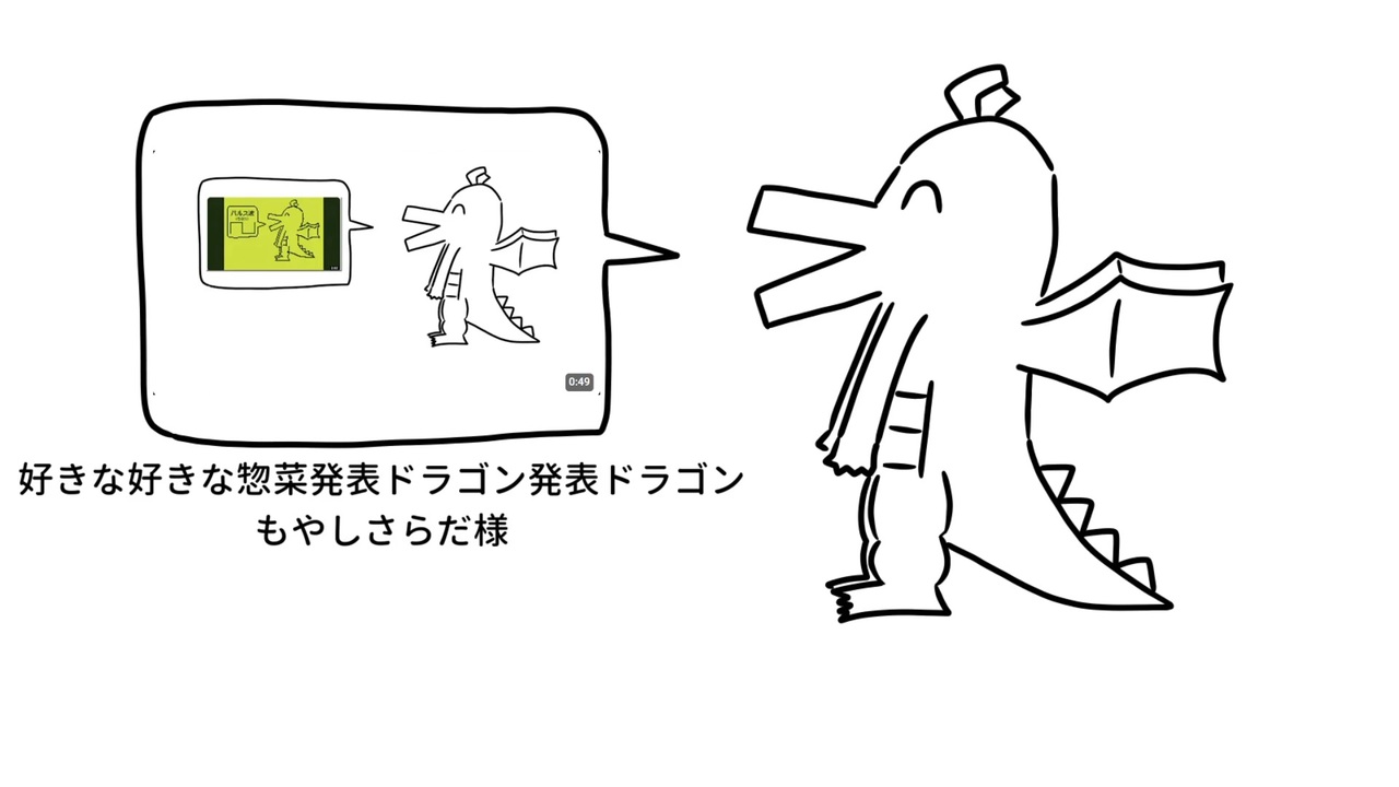 <span style="font-size: 24px;"><strong>本家様(好きな惣菜発表ドラゴン)→<a href="https://www.nicovideo.jp/watch/sm42515407" class="watch">sm42515407</a></strong></span><br><span style="font-size: 18px;">みんなの好きな好きな好きな惣菜発表ドラゴン発表ドラゴンも教えてください!!</span><br><br>たぶん初めまして、やっくーことダ王Pです~(/・ω・)/<br><span style="color: #ff0000;"><strong>ンバヂ様の「好きな惣菜発表ドラゴン」</strong></span><strong>替え歌第2弾</strong>です!なにこれ<br><strong>ニコニコ復活に合わせて投稿してみました!!!復活おめでとう&ありがとう!!!!!</strong><br><span style="font-size: 16px;"><strong>第1弾はこちら!→<a href="https://www.nicovideo.jp/watch/sm43816916" class="watch">sm43816916</a></strong></span><br><br>好きな好きな惣菜発表ドラゴン発表ドラゴン(もやしさらだ様)<a href="https://www.nicovideo.jp/watch/sm43588238" class="watch">sm43588238</a><br>好きな発表発表ドラゴン / 重音テト(家元様)<a href="https://www.youtube.com/watch?v=liE3XTUQ9HI" target="_blank" rel="noopener nofollow">https://www.youtube.com/watch?v=liE3XTUQ9HI</a><br>好きなドラゴン発表ドラゴン好きなドラゴン発表ドラゴン好きなドラゴン発表ドラゴン.psytranceremix(なみぐる様)<a href="https://www.nicovideo.jp/watch/sm43494240" class="watch">sm43494240</a><br>原曲作詞・作曲・絵・原曲動画:ンバヂ様 <a href="https://www.nicovideo.jp/user/33916307" target="_blank" rel="noopener">user/33916307</a><br>作詞・編曲・動画:ダ王P(やっくー) <a href="https://twitter.com/yakku_iwanna" target="_blank" rel="noopener nofollow">https://twitter.com/yakku_iwanna</a><br>唄:重音テト(UTAU)<br><br>【宣伝】<br>パロディを用いたボカロ曲(広義)を投稿しやすくする投稿祭「ごめんなさい投稿祭」を企画しています!パロディをしたい人もされたい人も是非チェックしてみてください!<br>Twitter(X)→<a href="https://x.com/gomennasai_fes" target="_blank" rel="noopener nofollow">https://x.com/gomennasai_fes</a><br>TwiPla→<a href="https://twipla.jp/events/612120" target="_blank" rel="noopener nofollow">https://twipla.jp/events/612120</a><br><br>歌詞<br>好きな好きな好きな惣菜発表ドラゴン発表ドラゴン発表ドラゴンが 好きな好きな好きな惣菜発表ドラゴン発表ドラゴンを発表します<br>好きな惣菜発表ドラゴン 発表 ドラゴン発表ドラゴン好きなドラゴン発表ドラゴン好きなドラゴン 一番最初に出てきたやつ<br>正式名称が分からない好きな好きな惣菜発表ドラゴン発表ドラゴンも 好き 好き 大好き<br><br>好きな好きな好きな惣菜発表ドラゴン発表ドラゴンがまた出てきたそのときは 発表したい 発表したい<br /><br>【各種リンク】<br>Twitter(X): <a href="https://twitter.com/yakku_iwanna" target="_blank" rel="noopener nofollow">https://twitter.com/yakku_iwanna</a><br>HP: <a href="https://yakkuiwanna.wordpress.com" target="_blank" rel="noopener nofollow">https://yakkuiwanna.wordpress.com</a><br>YouTube: <a href="https://www.youtube.com/@yakkudaohp" target="_blank" rel="noopener nofollow">https://www.youtube.com/@yakkudaohp</a>