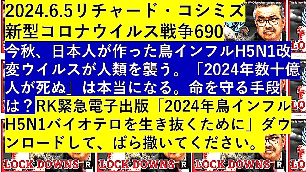 <span style="color: #cc4125;"><strong>「 テーマ : 新型コロナウイルス戦争 ⦅ 690 ⦆ 」</strong></span><br><br><span style="color: #ff0000;"><strong>「『 今秋 』、『 日本人 』が作った『 鳥インフルH5N1改変ウイルス 』が『 人類を襲う 』。<br> 『 2024年、数十億人が死ぬ 』は『 本当 』になる。<br> 『 命を守る手段は? 』、『 リチャード・コシミズ 緊急電子出版 』、『 2024年 鳥イン<br> フルH5N1バイオテロを生き抜くために 』を『 ダウンロード 』して、『 ばら撒いて下さい 』」</strong></span><br><br> <span style="color: #38761d;"><strong>◐『 2024年 鳥インフルH5N1バイオテロを生き抜くために 』</strong></span><br> <span style="color: #0000ff;"><strong><a href="https://x.gd/AG1bf" target="_blank" rel="noopener nofollow">https://x.gd/AG1bf</a></strong></span><br><br> <span style="color: #38761d;"><strong>◐『 イベルメクチン・アビガン服用後 』の体験談等をお寄せ下さい。RK</strong></span><br> <span style="color: #0000ff;"><strong>E-mail : richardkoshimizu@gmail.com</strong></span><br><br> <span style="color: #38761d;"><strong>◐ リチャード・コシミズ・チャンネル『⦅ ニコニコ チャンネル ⦆』</strong></span><br> <span style="color: #0000ff;"><strong><a href="https://ch.nicovideo.jp/richardkoshimizu" target="_blank" rel="noopener nofollow">https://ch.nicovideo.jp/richardkoshimizu</a></strong></span><br><br><span style="color: #38761d;"><strong> ◐ リチャード・コシミズ『 ニコニコ生放送⦅ LIVE ⦆』</strong></span><br> <span style="color: #0000ff;"><strong><a href="https://www.nicovideo.jp/user/120930363/live_programs" target="_blank" rel="noopener nofollow">https://www.nicovideo.jp/user/120930363/live_programs</a></strong></span><br><br>