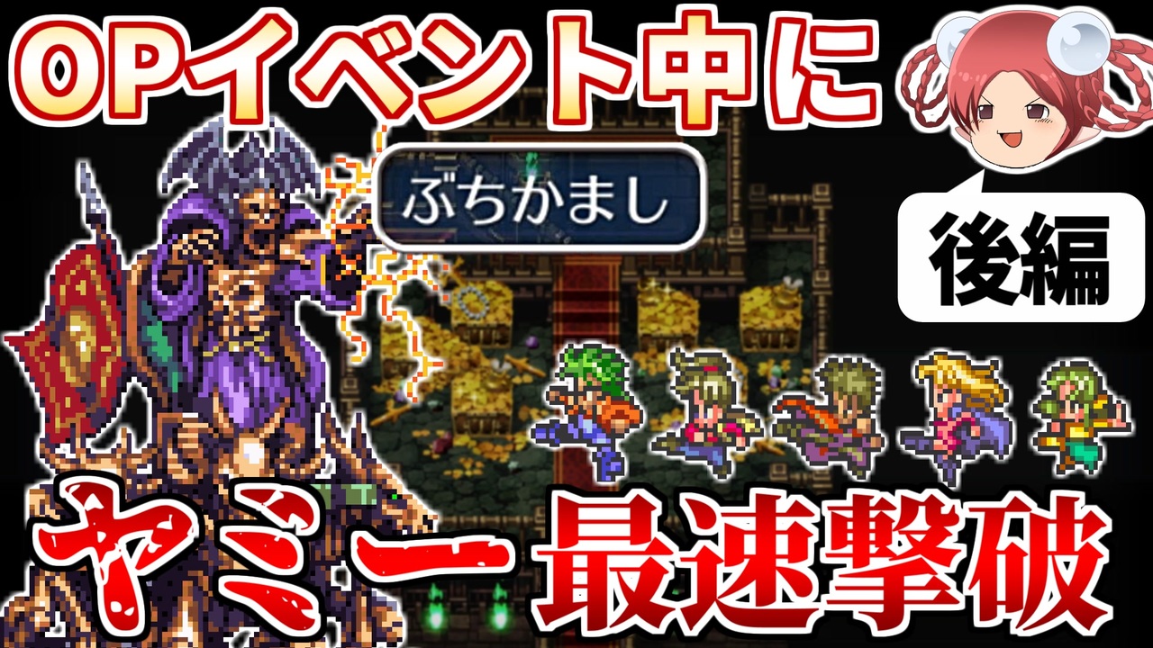 OPヤミーRTA、流行らせコラ!<br><br>【レギュレーション】<br>・NEWGAME押下からタイマースタート<br>・引継ぎなし<br>・オープニングイベント中にヤミーを撃破し、 <br> ファンファーレが鳴ったところでタイマーストップ<br>・バグ利用によるワープやすり抜け禁止<br><br>前編→<a href="https://www.nicovideo.jp/watch/sm43893655" class="watch">sm43893655</a><br><br>生放送アーカイブ→<a href="https://www.youtube.com/playlist?list=PLrkOMyVpbtkebzKOx0tUAfApJu2w0ZQbn" target="_blank" rel="noopener nofollow">https://www.youtube.com/playlist?list=PLrkOMyVpbtkebzKOx0tUAfApJu2w0ZQbn</a><br><br>他の挑戦シリーズとか→<a href="https://www.nicovideo.jp/mylist/3220744" target="_blank" rel="noopener">mylist/3220744</a> <br>YouTube版→<a href="https://goo.gl/oey5Y7" target="_blank" rel="noopener nofollow">https://goo.gl/oey5Y7</a><br>ニコニコニュースのインタビュー記事→<a href="https://originalnews.nico/284602" target="_blank" rel="noopener nofollow">https://originalnews.nico/284602</a><br><br>© 1995, 2019 SQUARE ENIX CO., LTD. All Rights Reserved.<br>Planned & Developed by ArtePiazza<br>ILLUSTRATION: TOMOMI KOBAYASHI<br>当該作品の転載・配布は禁止いたします。
