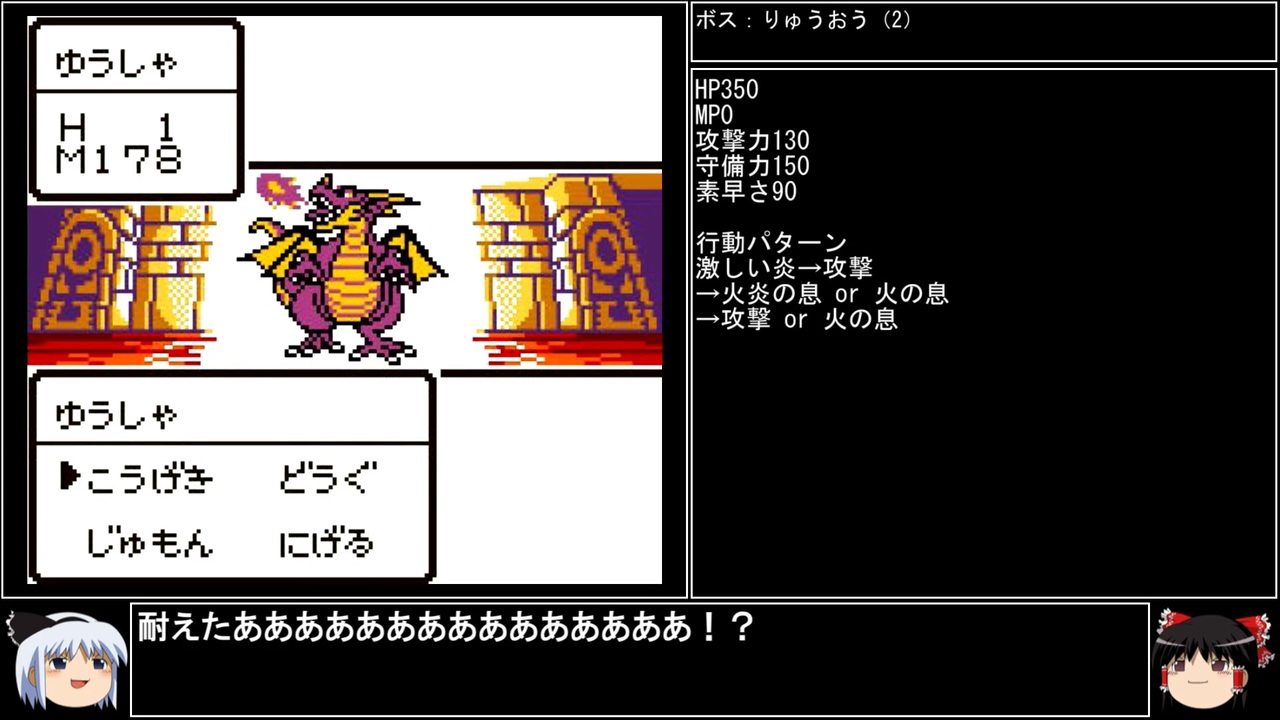 DQⅠの3周目、GBDQⅠ編part2です。 <br>「今にも燃えつきそうなオレの生命だが、竜王ごときにとらせてやるほど安くはない!」<br><br>前→<a href="https://www.nicovideo.jp/watch/sm43904701" class="watch">sm43904701</a><br>次→<a href="https://www.nicovideo.jp/watch/sm43906900" class="watch">sm43906900</a><br><br>YouTube版→<a href="https://youtu.be/e608v0HNbm0" target="_blank" rel="noopener nofollow">https://youtu.be/e608v0HNbm0</a><br><br>縛りルール(詳細はpart1参照)<br>①一度使った武器・防具・装飾品・道具・呪文・特技は<br> 次作品以降使用禁止。(売却も解禁扱い)<br><br> 一度使った職業(3,6,7)・仲間モンスター(5,6)・スカウトモンスター(8)は<br> 戦士(Ⅲ)、戦士(Ⅵ)のようにナンバリングで分類し次作品以降使用禁止。<br> また複数体加入できる仲間モンスターは一体まで。<br><br>②裏技、バグ技、全滅、逃走、おどかす禁止。<br> またダンジョン攻略とボス戦における状況再現禁止。<br><br>③ダンジョンとボス攻略は、全キャラのレベルを突入時、<br> 1周目は目標レベル+5。2周目は+10。3周目は+15まで。<br> ラスボスの目標レベルは45。裏ボスは50とする。<br>(目標レベルは各公式ガイドブックを参照)<br><br>④1周目はEDまで。2周目は裏ボス撃破まで。<br> 3周目は全てのボスを規定回数、規定ターン以内に倒す。<br>(回避可能なボスも倒し、闇ゾーマは3周全てで倒す)<br><br><br><span style="color: #262626;">※一部機種は互換機を使用してのプレイとなりますが、倍速機能やクイックセーブ・ロード、チートなどは一切使用しません。</span><br><br>※ネタバレ注意です<br><br>この動画で利用している株式会社スクウェア・エニックスを代表とする共同著作者が権利を所有する著作物及びスギヤマ工房有限会社が権利を所有する楽曲の転載・配布は禁止いたします。<br>(C) ARMOR PROJECT/BIRD STUDIO/SQUARE ENIX All Rights Reserved.<br>(C) SUGIYAMA KOBO (P) SUGIYAMA KOBO<br><br>AquesTalk2ライセンスID:AQTK2WINUSR23122185<br /><br><br>❤いいねを押していただけるとモチベーションと投稿速度が上がるので宜しくお願い致します!<br><br>作者ツイッター→ <a href="https://twitter.com/nig0117" target="_blank" rel="noopener nofollow">https://twitter.com/nig0117</a><br>PIXIV FANBOX→ <a href="https://sutanokeiji.fanbox.cc/" target="_blank" rel="noopener nofollow">https://sutanokeiji.fanbox.cc/</a><br><br>( 以前はWEB小説書いてました→ <a href="https://kakuyomu.jp/works/1177354054884910267" target="_blank" rel="noopener nofollow">https://kakuyomu.jp/works/1177354054884910267</a> )
