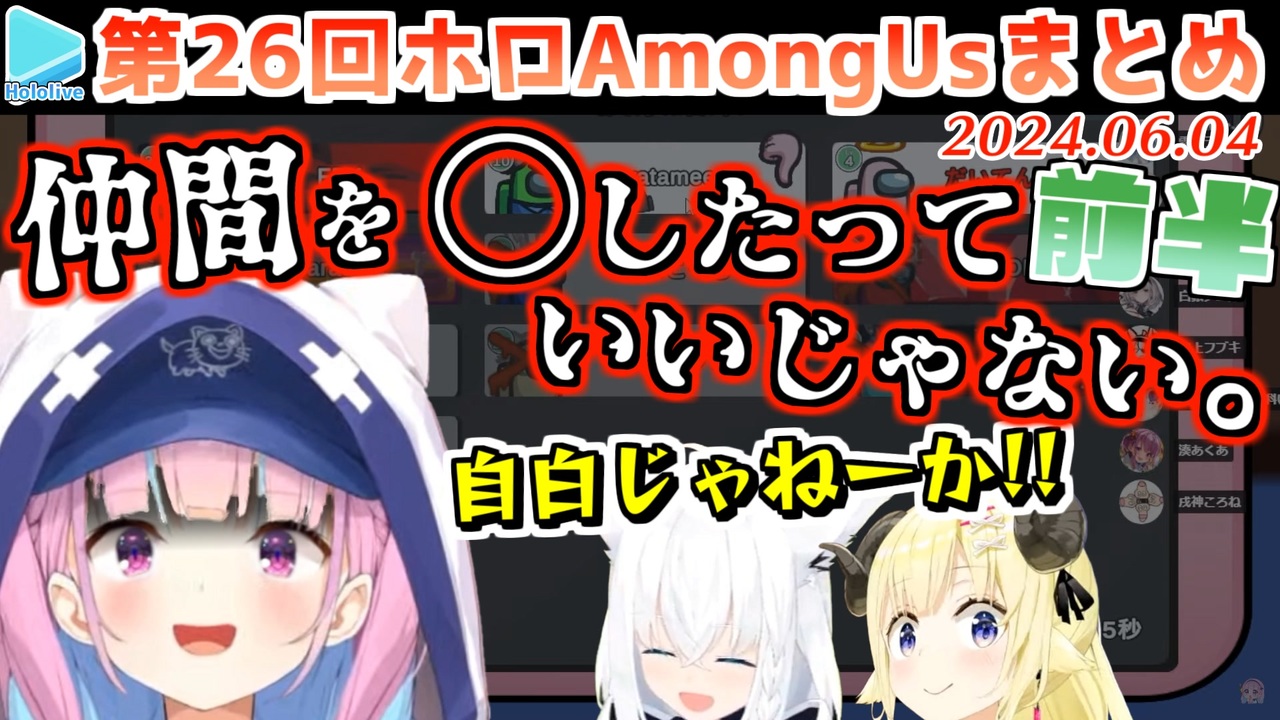 <a href="#" class="seekTime" data-seekTime="00:00" onclick="seekNicoPlayer('#00:00'); return false;">#00:00</a> 1試合目 おかゆ・ぺこら<br><a href="#" class="seekTime" data-seekTime="18:48" onclick="seekNicoPlayer('#18:48'); return false;">#18:48</a> 2試合目 おかゆ・ぺこら<br><a href="#" class="seekTime" data-seekTime="34:58" onclick="seekNicoPlayer('#34:58'); return false;">#34:58</a> 3試合目 フブキ・あくあ<br><a href="#" class="seekTime" data-seekTime="50:39" onclick="seekNicoPlayer('#50:39'); return false;">#50:39</a> 4試合目 あくあ・おかゆ<br><br>元動画様はこちら<br>【#ホロAmongUs】ヨッテラッシャイ…ミテラッシャイ…シラカミ視点のジカンダヨ【白上フブキ/ホロライブ】<br><a href="https://youtu.be/rLR5PpWeDTE" target="_blank" rel="noopener nofollow">https://youtu.be/rLR5PpWeDTE</a><br><br>【ホロAmongUs】アッドモッコンチハ・・・!【湊あくあ/ホロライブ】<br><a href="https://youtu.be/1aC8sy9DjOI" target="_blank" rel="noopener nofollow">https://youtu.be/1aC8sy9DjOI</a><br><br>【ホロamongus 】超絶久しぶり みんなでアモアスだああっ【 猫又おかゆ視点 】<br><a href="https://youtu.be/ih_FgQb3PMk" target="_blank" rel="noopener nofollow">https://youtu.be/ih_FgQb3PMk</a><br><br>【ホロAmongUs】ころね支店!<br><a href="https://youtu.be/VcrXwIHN3Bk" target="_blank" rel="noopener nofollow">https://youtu.be/VcrXwIHN3Bk</a><br><br>【#ホロAmongUs】ナイフぺろぺろ【ホロライブ/兎田ぺこら】<br><a href="https://youtu.be/vNUaQm_QmpA" target="_blank" rel="noopener nofollow">https://youtu.be/vNUaQm_QmpA</a><br><br>【ホロamongus】 久々でドキドキ太郎な女騎士ッッ【白銀ノエル/ホロライブ】<br><a href="https://youtu.be/vL9KLXBieSY" target="_blank" rel="noopener nofollow">https://youtu.be/vL9KLXBieSY</a><br><br>【 ホロAmongUs 】どこからどう見ても人畜無害な羊です!【角巻わため/ホロライブ4期生】<br><a href="https://youtu.be/52W8H9ehaho" target="_blank" rel="noopener nofollow">https://youtu.be/52W8H9ehaho</a><br><br>【ホロamongus 】狂人プレイ…しちゃいますかぁ(首ポキポキ)【雪花ラミィ視点】<br><a href="https://youtu.be/O-aqHRyrlS0" target="_blank" rel="noopener nofollow">https://youtu.be/O-aqHRyrlS0</a><br><br>【ホロamongus】久々のだましあい愛し合い傷つけ合いそして涙・・・【尾丸ポルカ視点/ホロライブ】<br><a href="https://youtu.be/wXgx7SqQpNc" target="_blank" rel="noopener nofollow">https://youtu.be/wXgx7SqQpNc</a><br><br>【 ホロAmongUs 】 1年に1度の掃除屋タイム! AmongUs【ホロライブ/沙花叉クロヱ】<br><a href="https://youtu.be/LoSe9lsuCnE" target="_blank" rel="noopener nofollow">https://youtu.be/LoSe9lsuCnE</a><br /><span style="color: #b7b7b7; font-size: 10px;">ホロライブ切り抜き/なめたけ <a href="https://t.co/CBwJLnYR2c" target="_blank" rel="noopener nofollow">https://t.co/CBwJLnYR2c</a></span>