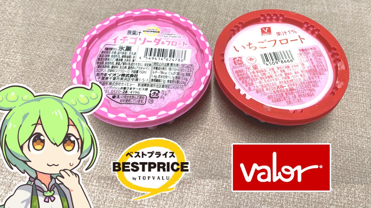 夏はカップに入ったかき氷が美味しい季節<br> 今回はトップバリュと岐阜県の食品スーパー、バローの商品で<br> 食べ比べをしていきます。<br><br><br> 【関連動画】 <br>トップバリュの黄色いヤツ「アイスバー」<br> <a href="https://www.nicovideo.jp/watch/sm42218686" target="_blank" rel="noopener nofollow">https://www.nicovideo.jp/watch/sm42218686</a><br> イオンの「新潟県フェア(2023年12月8日)」<br> <a href="https://www.nicovideo.jp/watch/sm43128687" target="_blank" rel="noopener nofollow">https://www.nicovideo.jp/watch/sm43128687</a><br> トップバリュの黄色いヤツ「サクレっぽいかき氷」<br> <a href="https://www.nicovideo.jp/watch/sm42528504" target="_blank" rel="noopener nofollow">https://www.nicovideo.jp/watch/sm42528504</a><br><br>【参考】 イチゴソーダ&フロート(トップバリュ)<br> <a href="https://www.topvalu.net/items/detail/4549414624786/" target="_blank" rel="noopener nofollow">https://www.topvalu.net/items/detail/4549414624786/</a> <br>スーパーマーケット バロー<br> <a href="https://valor.jp/" target="_blank" rel="noopener nofollow">https://valor.jp/</a> <br>株式会社セイヒョー<br> <a href="https://www.seihyo.co.jp/" target="_blank" rel="noopener nofollow">https://www.seihyo.co.jp/</a> <br>フタバ食品株式会社 <br><a href="https://www.futabafoods.co.jp/" target="_blank" rel="noopener nofollow">https://www.futabafoods.co.jp/</a> <br><br>【使用した素材】(※敬称略) <br>(合成音声)VOICEVOX/ずんだもん/四国めたん <br><a href="https://voicevox.hiroshiba.jp/" target="_blank" rel="noopener nofollow">https://voicevox.hiroshiba.jp/</a> <br>(立ち絵)坂本アヒル <br><a href="https://seiga.nicovideo.jp/seiga/im10788496" target="_blank" rel="noopener">im10788496</a>/<a href="https://seiga.nicovideo.jp/seiga/im10791276" target="_blank" rel="noopener">im10791276</a> (楽曲)<br>甘茶の音楽工房/「楽しい麦畑」「お城の舞踏会」「残業戦士」<br> <a href="https://amachamusic.chagasi.co" target="_blank" rel="noopener nofollow">https://amachamusic.chagasi.co</a>