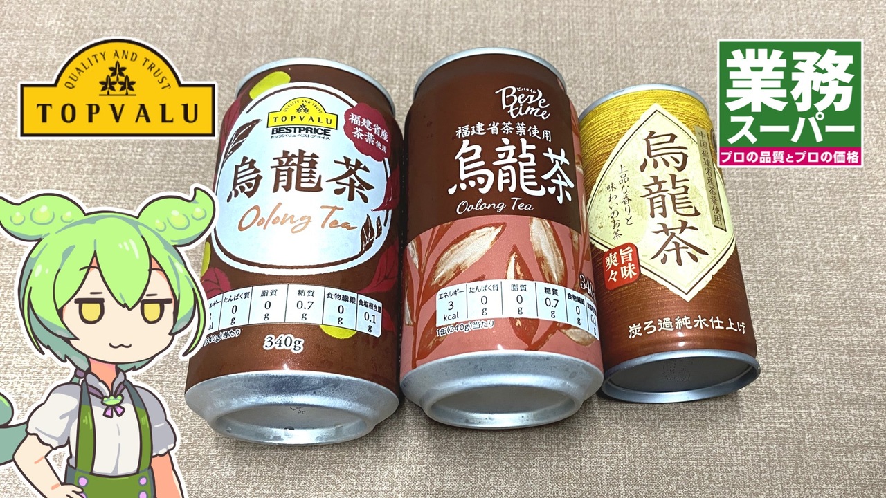 トップバリュと業務スーパーの缶タイプのウーロン茶です。 <br>今回の黄トプバは自宅の食品棚の奥にあったもので<br> 編集している時に期限が切れていることに気づき <br>参考記録として動画にすることにしました。<br><br><br>【参考】 ビバタイム 烏龍茶(トップバリュ)※真ん中のウーロン茶 <a href="https://www.topvalu.net/items/detail/4549414445893/" target="_blank" rel="noopener nofollow">https://www.topvalu.net/items/detail/4549414445893/</a> <br>神戸茶房烏龍茶缶 185g(業務スーパー)<br> <a href="https://www.gyomusuper.jp/onlineshop/products/detail/7276" target="_blank" rel="noopener nofollow">https://www.gyomusuper.jp/onlineshop/products/detail/7276</a><br> ヤマナカビバレッジ株式会社<br> <a href="https://www.yamanaka-beverage.jp/" target="_blank" rel="noopener nofollow">https://www.yamanaka-beverage.jp/</a> <br>「ペットボトル」の「お茶」を振ったら、まるで洗剤のように泡がたちました。<br>飲んでも大丈夫ですか?(伊藤園)<br><a href="https://www.itoen.jp/customer/faq/38805/" target="_blank" rel="noopener nofollow">https://www.itoen.jp/customer/faq/38805/</a><br><br>【使用した素材】(※敬称略) <br>(合成音声)VOICEVOX/ずんだもん/四国めたん<br> <a href="https://voicevox.hiroshiba.jp/" target="_blank" rel="noopener nofollow">https://voicevox.hiroshiba.jp/</a> <br>(立ち絵)坂本アヒル<br> <a href="https://seiga.nicovideo.jp/seiga/im10788496" target="_blank" rel="noopener">im10788496</a>/<a href="https://seiga.nicovideo.jp/seiga/im10791276" target="_blank" rel="noopener">im10791276</a><br> (楽曲)甘茶の音楽工房/「日々是好日」<br><a href="https://amachamusic.chagasi.com/" target="_blank" rel="noopener nofollow">https://amachamusic.chagasi.com/</a><br>