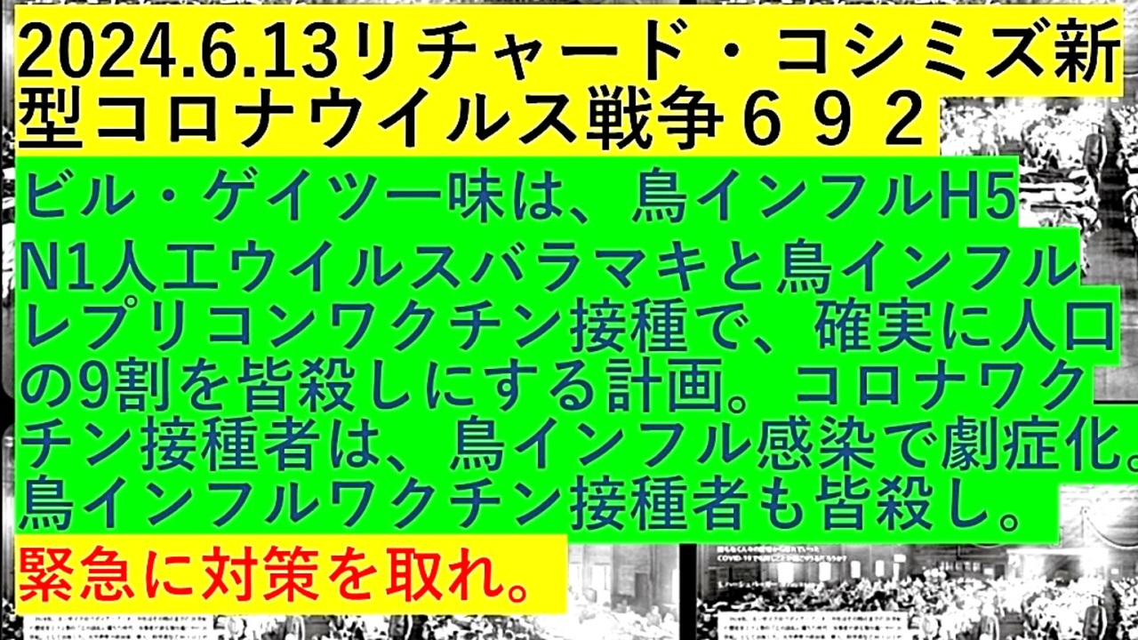 <span style="color: #cc4125;"><strong>「 テーマ : 新型コロナウイルス戦争 ⦅ 692 ⦆ 」</strong></span><br><br><span style="color: #ff0000;"><strong>「『 ビル・ゲイツ一味 』は、『 鳥インフルH5N1人工ウイルスバラマキ 』と『 鳥インフルレプリコン<br> ワクチン接種 』で、確実に『「 人口の9割を皆殺し 」にする計画 』。<br> 『 コロナワクチン接種者 』は、『 鳥インフル感染 』で『 劇症化 』。<br> 『 鳥インフルワクチン接種者 』も『 皆殺し 』。『 緊急に対策を取れ! 』」</strong></span><br><br> <span style="color: #38761d;"><strong>◐『 2024年 鳥インフルH5N1バイオテロを生き抜くために 』</strong></span><br> <span style="color: #0000ff;"><strong><a href="https://x.gd/AG1bf" target="_blank" rel="noopener nofollow">https://x.gd/AG1bf</a></strong></span><br><br> <span style="color: #38761d;"><strong>◐ 『 リチャード・コシミズ・チャンネル⦅ ニコニコ チャンネル ⦆』</strong></span><br> <span style="color: #0000ff;"><strong><a href="https://ch.nicovideo.jp/richardkoshimizu" target="_blank" rel="noopener nofollow">https://ch.nicovideo.jp/richardkoshimizu</a></strong></span><br><br><span style="color: #38761d;"><strong> ◐ 『 リチャード・コシミズ ニコニコ生放送⦅ LIVE ⦆』</strong></span><br> <span style="color: #0000ff;"><strong><a href="https://www.nicovideo.jp/user/120930363/live_programs" target="_blank" rel="noopener nofollow">https://www.nicovideo.jp/user/120930363/live_programs</a></strong></span><br><br> <span style="color: #38761d;"><strong>◐ リチャード・コシミズ『 Rumble 』公式 動画ギャラリー</strong></span><br> <span style="color: #0000ff;"><strong><a href="https://rumble.com/user/richardkoshimizu" target="_blank" rel="noopener nofollow">https://rumble.com/user/richardkoshimizu</a></strong></span><br><br>
