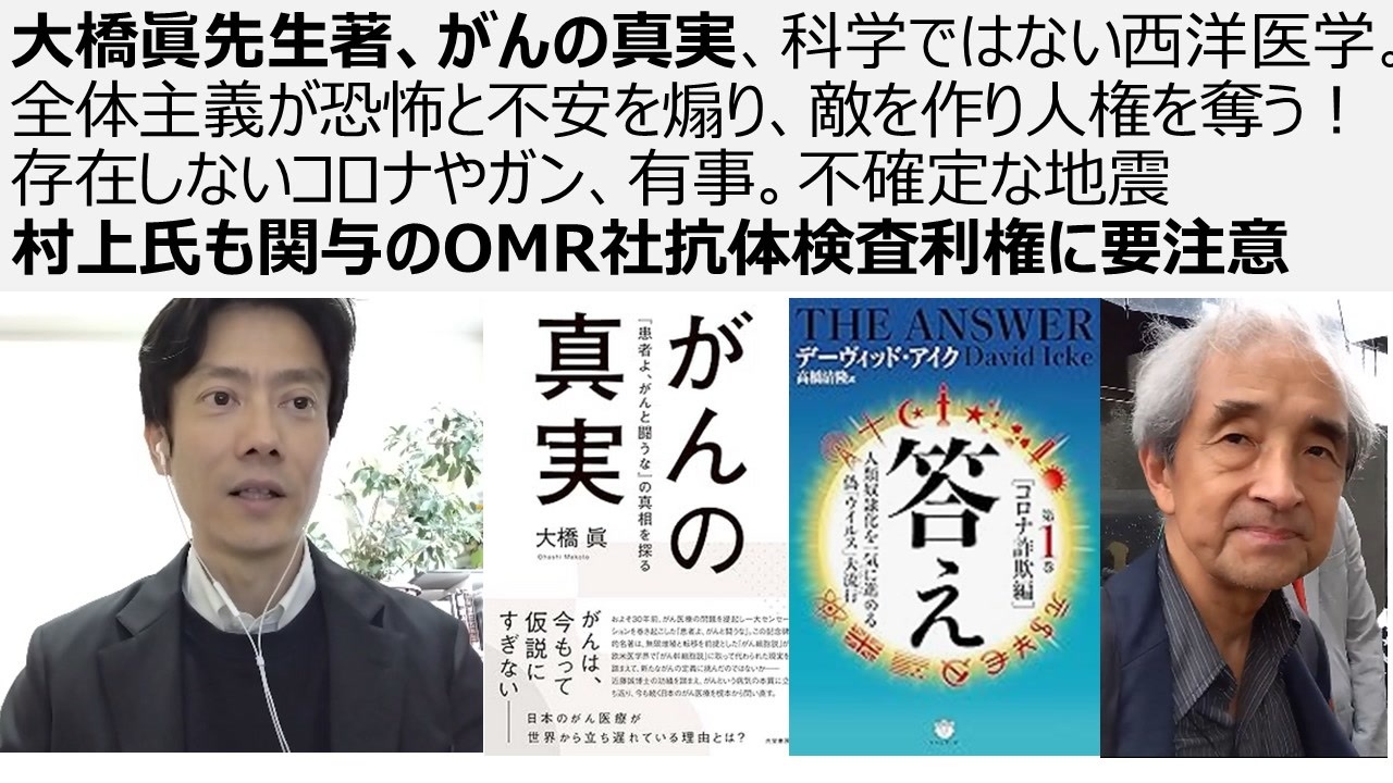 ガンの真実 大橋眞先生<br><a href="https://www.amazon.co.jp/dp/B0CXYJZZGY/" target="_blank" rel="noopener nofollow">https://www.amazon.co.jp/dp/B0CXYJZZGY/</a><br><br>答え 第1巻[コロナ詐欺編] <br>デービッドアイク著、高橋清隆さん訳<br><a href="https://www.amazon.co.jp/dp/4864717702/" target="_blank" rel="noopener nofollow">https://www.amazon.co.jp/dp/4864717702/</a><br><br>OMR社のサイト 村上氏が代表の会社のサイト<br><a href="https://www.omr.co.jp/company" target="_blank" rel="noopener nofollow">https://www.omr.co.jp/company</a><br><br>「今までの検査では、実際に感染したときにできる抗体と予防接種によってできる抗体の判別が困難で、その量も正確には測定できませんでした。OMRの抗体検査ではそれぞれの量を正確に測定することができるようになり、その新たな解析技術は、新型コロナウイルス感染症に画期的なものとされ、NHKニュース・新聞でも報道され注目されています。 」<br><a href="http://www.tomo-clinic.tokyo/omr.html" target="_blank" rel="noopener nofollow">http://www.tomo-clinic.tokyo/omr.html</a><br><br>言論統制機関 ユーチューブのポリシー<br><a href="https://support.google.com/youtube/answer/13813322?hl=ja" target="_blank" rel="noopener nofollow">https://support.google.com/youtube/answer/13813322?hl=ja</a><br>日本国独立宣言論 私は独立を宣言する! 真田信秋<br><a href="https://amzn.to/3D90lwx" target="_blank" rel="noopener nofollow">https://amzn.to/3D90lwx</a><br> <br>主権者命令書 主権破壊を許すな 売国傀儡日本政府を解体せよ 真田<br><a href="https://amzn.to/49z51b5" target="_blank" rel="noopener nofollow">https://amzn.to/49z51b5</a><br> <br>マトリックス洗脳社会 グローバル企業ディストピア 真田<br><a href="https://amzn.to/4g2YmZg" target="_blank" rel="noopener nofollow">https://amzn.to/4g2YmZg</a><br><br>日米合同委員会廃絶・抗議街宣 日米合同委員会は無効である 我々は独立を宣言する 真田著、編<br><a href="https://amzn.to/405pVLY" target="_blank" rel="noopener nofollow">https://amzn.to/405pVLY</a><br><br>日本の独立 植草一秀先生<br><a href="https://amzn.to/3VUtgv4" target="_blank" rel="noopener nofollow">https://amzn.to/3VUtgv4</a><br>