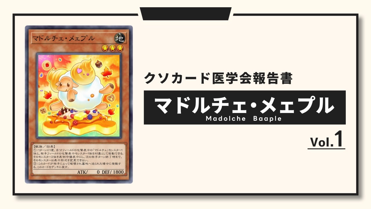 デュエルで笑顔を・・・。キミの力で、世界に・・・みんなのクソカードに、笑顔を・・・<br><span style="color: #ffffff;">全ての「マドルチェ」カードの未来に、笑顔を・・・</span><br><br>【チャプター】<br><a href="#" class="seekTime" data-seekTime="00:36" onclick="seekNicoPlayer('#00:36'); return false;">#00:36</a> 診断フェイズ<br> 患者紹介<br> 患者の容態<br><a href="#" class="seekTime" data-seekTime="07:14" onclick="seekNicoPlayer('#07:14'); return false;">#07:14</a> 治療フェイズ<br> 治療<br> デッキ紹介<br><a href="#" class="seekTime" data-seekTime="19:36" onclick="seekNicoPlayer('#19:36'); return false;">#19:36</a> 終わりに<br><br><br>本動画は、あまくだり様(<a href="https://www.nicovideo.jp/user/82678858" target="_blank" rel="noopener">user/82678858</a>)の『クソカード診療所』シリーズ(<a href="https://www.nicovideo.jp/series/321504" target="_blank" rel="noopener">series/321504</a>)、並びに有志の『クソカード医学会報告書』をリスペクトして製作しております。<br><br> 読み上げ:雨晴はう / VOICEVOX<br> 立ち絵:雨晴はう立ち絵素材(<a href="https://seiga.nicovideo.jp/seiga/im10880094" target="_blank" rel="noopener">im10880094</a>) / 坂本アヒル様(<a href="https://www.nicovideo.jp/user/97452727" target="_blank" rel="noopener">user/97452727</a>)<br>使用ソフト:AviUtl<br> 遊戯王マスターデュエル