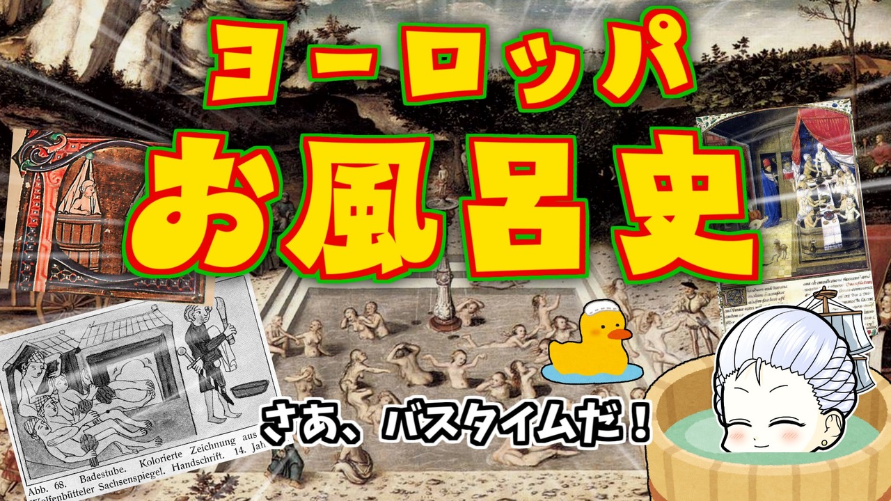 マリーは日々の疲れを癒しているようです。 <br><br>古代ローマお風呂?うん、テルマエ・ロマエで見た! って人は多いかもしれませんが、それ以外のヨーロッパのお風呂文化ってあんまり知られていませんよね。 <br><br>たとえば中世では風呂屋は床屋とセットだったり。風呂に入って泥と汗を流し、髭を剃り、髪を整える。そのほか各種サービス(意味深)も… おっとネタバレはここまでだ!とりあえず再生数を稼がせてください。 <br><br>今回の参考文献: <br>ドミニック・ラティ(2006)『お風呂の歴史』高遠弘美訳 白水社<br>ウィンストン・ブラック(2021)『中世ヨーロッパ ファクトとフィクション』大貫俊夫監訳 平凡社<br>河原温(1996)『中世ヨーロッパの都市世界』山川出版<br>ハインリヒ・プレティヒャ(2010)『中世への旅 騎士と城』平尾浩三訳 白水社<br>ハインリヒ・プレティヒャ(2023)『中世への旅 都市と庶民』関楠生訳 白水社<br>エルンスト・シューベルト(2005)『名もなき中世人の日常』藤代幸一訳 八坂書房 <br>キャロリーヌ・コステドア/ミシェル・シニョリ(2022)『ペスト 埋葬地から第二のパンデミックを再検討する』井上雅俊訳 白水社<br><br>その他 Wikipediaなど<br />━━━━━━━━━━━━━━━━━━━━━<br><br>この動画はクリエイティブ・コモンズ継承(CC-BY-SA)ライセンスの素材を使用して制作しています。(<a href="https://creativecommons.org/licenses/by-sa/4.0/)" target="_blank" rel="noopener nofollow">https://creativecommons.org/licenses/by-sa/4.0/)</a><br>規約に基づき、この動画もCC-BY-SA 4.0 のもとで公開します。<br><br>投稿者共通情報☆彡<br><br>BGM, SE:ニコニ・コモンズ様<br><a href="http://commons.nicovideo.jp/" target="_blank" rel="noopener nofollow">http://commons.nicovideo.jp/</a><br>魔王魂様<br><a href="https://maoudamashii.jokersounds.com/" target="_blank" rel="noopener nofollow">https://maoudamashii.jokersounds.com/</a><br>Audiostock様<br><a href="https://audiostock.jp/" target="_blank" rel="noopener nofollow">https://audiostock.jp/</a><br><br>立ち絵 霊夢・魔理沙(黒子式):nicotalk様<br><a href="http://www.nicotalk.com/charasozai.html" target="_blank" rel="noopener nofollow">http://www.nicotalk.com/charasozai.html</a><br><br>立ち絵 パトラ、マリー、アン、メアリ:ライフライフ様<br><a href="https://0801lifelife.tumblr.com/" target="_blank" rel="noopener nofollow">https://0801lifelife.tumblr.com/</a><br><br>使用ツール1:ゆっくりムービーメーカー4<br><a href="https://manjubox.net/ymm4/" target="_blank" rel="noopener nofollow">https://manjubox.net/ymm4/</a><br><br>使用ツール2:AviUtl<br><a href="http://spring-fragrance.mints.ne.jp/aviutl/" target="_blank" rel="noopener nofollow">http://spring-fragrance.mints.ne.jp/aviutl/</a><br><br>各時代の地図 : World History Maps & Timelines <br><a href="http://geacron.com/home-en/" target="_blank" rel="noopener nofollow">http://geacron.com/home-en/</a><br><br>ゆっくりボイスについて:AquesTalkライセンス取得済み<br><br>キャラクターボイス<br>アン・ボニー:羽ノ華(A.I.VOICE)<br>メアリ・リード:琴葉 葵(A.I.VOICE)<br>クレオパトラ:結月ゆかり(VOICEROID2)<br>マリー‐アントワネット:東北きりたん (VOICEROID EX)<br>その他キャラ:青山龍星(A.I.VOICE)、伊織弓鶴(A.I.VOICE2)、栗田まろん(A.I.VOICE)、宮舞モカ(VOICEPEAK)、フリモメン(VOICEPEAK)<br><br><br><br>その他フリー素材ご提供元の皆様に圧倒的感謝<br>