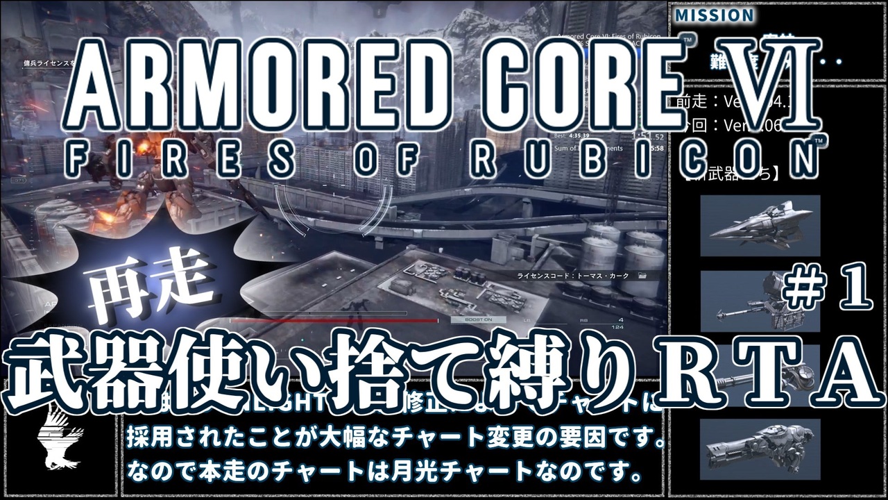 (ニコニコ復活後の)初投稿です。<br>AC6/アーマードコア6武器使い捨て縛りRTAを再走して、<br>約9分の更新を達成したので動画化しました。<br>Part1:密航~壁越え<br><br>Part1:ここ<br>次→<a href="https://www.nicovideo.jp/watch/sm44008523" class="watch">sm44008523</a><br><br>前走はこちらから!<br>⇒<a href="https://www.nicovideo.jp/watch/sm43142367" class="watch">sm43142367</a><br><br>武器使い捨て縛りコーラルリリースRTAもよろしく!<br>⇒<a href="https://www.nicovideo.jp/watch/sm43431310" class="watch">sm43431310</a><br><br>無編集版はyoutubeに上げてます!<br><a href="https://youtu.be/3XVyr6UIo2g" target="_blank" rel="noopener nofollow">https://youtu.be/3XVyr6UIo2g</a><br><br>YouTubeにもアップロードしています!<br><a href="https://youtu.be/30w6TLjNNts" target="_blank" rel="noopener nofollow">https://youtu.be/30w6TLjNNts</a><br><br>【ルール】<br>①腕、肩の武器は1種類につき1つのミッションorアリーナでのみ使用可能<br>②左右は別々でカウント<br>③パンチは左右1回ずつのみ使用可能<br>④OS強化によるアクション(ブーストキック、アサルトアーマー等)は制限なし<br>⑤武器以外の内装・外装パーツは自由<br>⑥他のミッションで使用した武器、使用予定の武器を使ってしまった場合はミッションを最初からやり直せば続行可能。<br>⑦武器を装備して出撃しても使用しなければ使い捨て対象外<br>⑧初期データから始めて1週目クリアまで。エンディングは自由。<br>⑨AC DATAは使用しない。<br>【プレイ環境】<br>・PS5版、Ver.1.06.1
