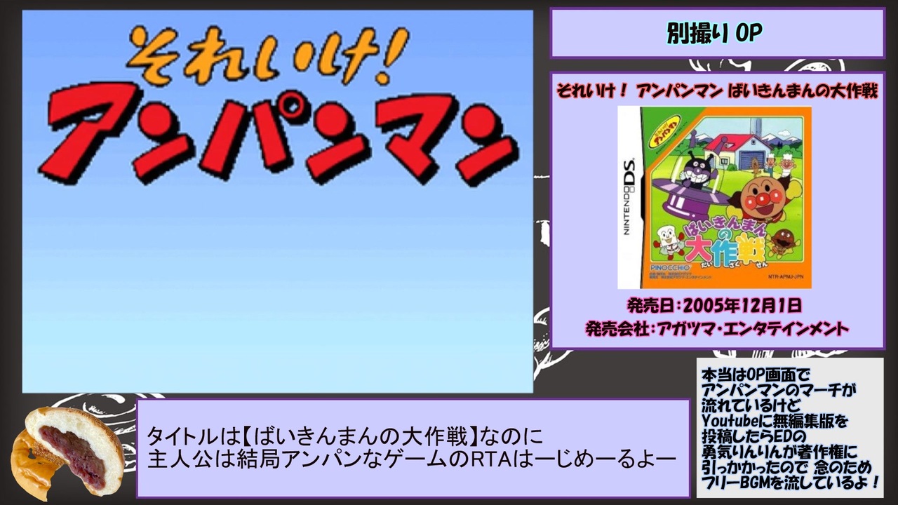 アンパンマンに少し詳しくなれるRTA 第2弾<br>アンケート投票ありがとでした!<br><br>オープニング~エンディングまで<br><br>ほぼ無編集版:<a href="https://youtu.be/n3Uq9U8ubLw" target="_blank" rel="noopener nofollow">https://youtu.be/n3Uq9U8ubLw</a><br>第1弾:<a href="https://www.nicovideo.jp/watch/sm42973518" class="watch">sm42973518</a><br><br>使用ハード:3DSLL (偽トロ)<br>タイマースタート:初めからを選択した時<br>タイマーストップ:ED直前の画面が白くなった時<br><br>音楽:独り音 様 <a href="https://az-ho.org/" target="_blank" rel="noopener nofollow">https://az-ho.org/</a><br><br>X:<a href="https://twitter.com/yuyu_studygame" target="_blank" rel="noopener nofollow">https://twitter.com/yuyu_studygame</a> <br><br>リクエストや質問受付↓<br>マシュマロ:<a href="https://marshmallow-qa.com/3vudabzgubyione?t=xsV3ct&utm_medium=url_text&utm_source=promotion" target="_blank" rel="noopener nofollow">https://marshmallow-qa.com/3vudabzgubyione?t=xsV3ct&utm_medium=url_text&utm_source=promotion</a>