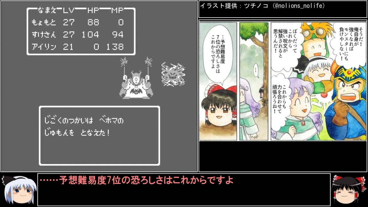 DQⅡの1周目、FCDQⅡ編part5です。 <br>攻略情報がない時代の謎解き、改めて見るとエグイですね。 動画の最後に「起こられる」と変換ミスしてますが、8月は多忙すぎて直す気力がなかったのでそのままで許して。<br><br>前→<a href="https://www.nicovideo.jp/watch/sm43962890" class="watch">sm43962890</a><br>次→<a href="https://www.nicovideo.jp/watch/sm43973342" class="watch">sm43973342</a><br><br>YouTube版→<a href="https://youtu.be/D2yN0zYhDLY" target="_blank" rel="noopener nofollow">https://youtu.be/D2yN0zYhDLY</a><br><br>縛りルール(詳細はpart1参照)<br>①一度使った武器・防具・装飾品・道具・呪文・特技は<br> 次作品以降使用禁止。(売却も解禁扱い)<br><br> 一度使った職業(3,6,7)・仲間モンスター(5,6)・スカウトモンスター(8)は<br> 戦士(Ⅲ)、戦士(Ⅵ)のようにナンバリングで分類し次作品以降使用禁止。<br> また複数体加入できる仲間モンスターは一体まで。<br><br>②裏技、バグ技、全滅、逃走、おどかす禁止。<br> またダンジョン攻略とボス戦における状況再現禁止。<br><br>③ダンジョンとボス攻略は、全キャラのレベルを突入時、<br> 1周目は目標レベル+5。2周目は+10。3周目は+15まで。<br> ラスボスの目標レベルは45。裏ボスは50とする。<br>(目標レベルは各公式ガイドブックを参照)<br><br>④1周目はEDまで。2周目は裏ボス撃破まで。<br> 3周目は全てのボスを規定回数、規定ターン以内に倒す。<br>(回避可能なボスも倒し、闇ゾーマは3周全てで倒す)<br><br><br><span style="color: #262626;">※一部機種は互換機を使用してのプレイとなりますが、倍速機能やクイックセーブ・ロード、チートなどは一切使用しません。</span><br><br>※ネタバレ注意です<br><br>この動画で利用している株式会社スクウェア・エニックスを代表とする共同著作者が権利を所有する著作物及びスギヤマ工房有限会社が権利を所有する楽曲の転載・配布は禁止いたします。<br>(C) ARMOR PROJECT/BIRD STUDIO/SQUARE ENIX All Rights Reserved.<br>(C) SUGIYAMA KOBO (P) SUGIYAMA KOBO<br><br>AquesTalk2ライセンスID:AQTK2WINUSR23122185<br /><br><br>❤いいねを押していただけるとモチベーションと投稿速度が上がるので宜しくお願い致します!<br><br>作者ツイッター→ <a href="https://twitter.com/nig0117" target="_blank" rel="noopener nofollow">https://twitter.com/nig0117</a><br>PIXIV FANBOX→ <a href="https://sutanokeiji.fanbox.cc/" target="_blank" rel="noopener nofollow">https://sutanokeiji.fanbox.cc/</a><br><br>( 以前はWEB小説書いてました→ <a href="https://kakuyomu.jp/works/1177354054884910267" target="_blank" rel="noopener nofollow">https://kakuyomu.jp/works/1177354054884910267</a> )