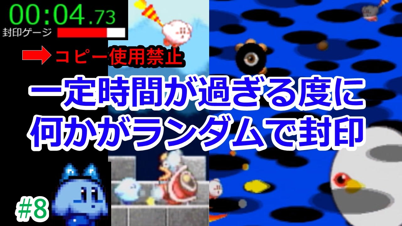いいねクイズ第8弾!<br>「最近映画館に見に行った映画」<br><br>縛り内容 <br>・時間が40秒経過する度にランダムで基本動作・コピー・グーイ・アイテ ム・敵・障害物が1つ封印される。 <br>・封印発生のタイミングはステージクリア後。 <br>・封印後にセーブ。次の封印時まで試行回数殴りOK。 <br>・敵や障害物を15匹撃破する度に、封印物使用権をエクステンド。<br> 進行不可に陥った場合のみ、封印物使用権を1つ消費し、封印物を1度使用可。 その際、最も封印物使用回数が少ない攻略法を採る。 <br>・時間計測はファイルセレクト~ラスボスを倒した瞬間 <br>・タイトル画面へのゲームリセット禁止。 <br>・タイムリミットは1時間53分20秒。 (封印対象物について) <br>・基本動作の内、「ジャンプ」「すいこみ」「のみこみ」「はきだし」「しゃがみ」は封印対象外。<br><br><br>過去シリーズ → <a href="https://www.nicovideo.jp/mylist/71307387" target="_blank" rel="noopener">mylist/71307387</a><br>告知 → <a href="https://twitter.com/mazoriahosh" target="_blank" rel="noopener nofollow">https://twitter.com/mazoriahosh</a><br>youtube → <a href="https://www.youtube.com/watch?v=qskHDlLNypY" target="_blank" rel="noopener nofollow">https://www.youtube.com/watch?v=qskHDlLNypY</a>