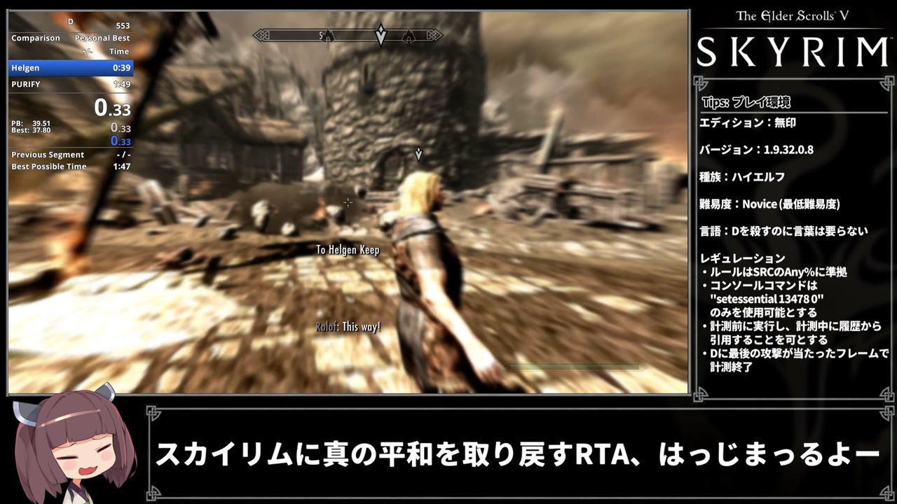 多分これが一番早いと思います。<br><br>LRT: 1分45秒98 LRT=ロード時間を除いた記録<br>RTA: 1分59秒10 <br><br>LRT最速:<a href="https://www.nicovideo.jp/watch/sm43961358" class="watch">sm43961358</a> (1分45秒60)<br>個人的には将来的にLiveSplit使ってスペック関係なく公平な記録で競う世界線があったらなと思っています。ちなみに、現在見れる前のWRをこの動画と同じタイミングメソッドでLRTに換算すると推定1分52秒44です。<a href="https://www.nicovideo.jp/watch/sm40072127" class="watch">sm40072127</a><br><span style="font-size: 10px;">だからこの記録はマシンパワーでゴリ押してるだけとか思わないで;;</span><br><br><strong>レギュレーション</strong> <br>・SRCのAny%ルールに準拠 <br><a href="https://www.speedrun.com/skyrim?h=Main_Quest-pc&rules=game&x=w20p7jkn-jlz36082.013x3dk1" target="_blank" rel="noopener nofollow">https://www.speedrun.com/skyrim?h=Main_Quest-pc&rules=game&x=w20p7jkn-jlz36082.013x3dk1</a> <br><a href="https://www.speedrun.com/skyrim?h=Main_Quest-pc&rules=category&x=w20p7jkn-jlz36082.013x3dk1" target="_blank" rel="noopener nofollow">https://www.speedrun.com/skyrim?h=Main_Quest-pc&rules=category&x=w20p7jkn-jlz36082.013x3dk1</a> <br>・コンソールコマンドは"setessential 13478 0"のみ実行可能とする <br>・コマンドを計測前に実行し、計測中に履歴から引用することを可とする <br>・計測終了のタイミングはデルフィンに最後の攻撃が当たったフレーム <br><br>SEでフェードインをなくす方法 (Dead Loading) <br><a href="https://youtu.be/DcvsMpSveeo?si=8n9VvDNEGFOydhrk" target="_blank" rel="noopener nofollow">https://youtu.be/DcvsMpSveeo?si=8n9VvDNEGFOydhrk</a><br><br>参考にさせていただいた先駆者兄貴の動画<br><a href="https://www.nicovideo.jp/watch/sm36783377" class="watch">sm36783377</a><br><a href="https://www.nicovideo.jp/watch/sm36930679" class="watch">sm36930679</a><br><br>YouTube版:<a href="https://youtu.be/Zl6UfXZvLo4" target="_blank" rel="noopener nofollow">https://youtu.be/Zl6UfXZvLo4</a><br><br><span style="font-size: 16px;">バグ制限メインクエストの解説動画もあるから見てね:<a href="https://www.nicovideo.jp/watch/sm43980608" class="watch">sm43980608</a></span><br><br>最近はAny%を配信してるので、見に来ていただけると励みになります。<br><a href="https://www.twitch.tv/lithium_l_" target="_blank" rel="noopener nofollow">https://www.twitch.tv/lithium_l_</a><br><a href="https://www.youtube.com/@lithium_l" target="_blank" rel="noopener nofollow">https://www.youtube.com/@lithium_l</a>