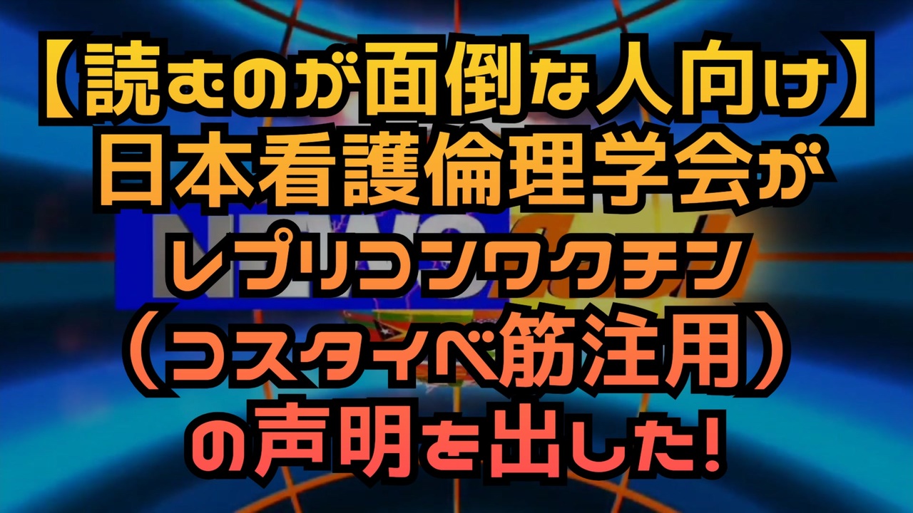 ※サムネ変更しました レプリコンワクチン=コスタイベ筋注用<br><br>日本看護倫理学会が<br>レプリコンの声明を出した!<br><br>自己増幅型 mRNA ワクチン(レプリコンワクチン)<br>日本は世界で唯一の認可国<br><br>治験を実施したベトナムでも認可されていない<br><br>非接種者に感染(シェディング)<br>望まない人にワクチンの成分が取り込まれてしまうという倫理的問題<br><br><a href="https://x.com/fraisst/status/1824616497593061555?t=mqiZ2YvEzSSUerwJyAqFoA&s=19" target="_blank" rel="noopener nofollow">https://x.com/fraisst/status/1824616497593061555?t=mqiZ2YvEzSSUerwJyAqFoA&s=19</a><br><br><br>【緊急声明】<br><br>新型コロナウイルス感染症予防接種に導入されるレプリコンワクチンへの懸念 自分と周りの人々のために<br><br>要約<br><br>一般社団法人日本看護倫理学会は、次世代型 mRNA ワクチンとして、世界で唯一日本の みで認可され、2024年10月1日から定期接種を開始するとされている自己増幅型 mRNA ワクチン(レプリコンワクチン) の安全性および倫理性に関する懸念を表明します。<br><br><br>いままでのワクチンが、ウイルスや細菌などの病原体を弱毒化したものやその成分を抗 原として接種しヒトの免疫応答を誘導するのに対し、遺伝子操作型ワクチンは、当該抗原 ( スパイクタンパク質)をヒトの細胞内の遺伝機構を用いて作らせる点が大きく異なります。<br><br>そして、昨年11月28日に、自己增幅型 mRNA ワクチン (レプリコンワクチン)が世界 に先駆けて日本で認可され、以来日本は世界で唯一の認可国 となっています。認可されたレプリコンワクチンは米国の Arcturus Therapeutics が開発 し、ベトナムでの大規模な治験(第1~第III相臨床試験) (Hồ et al., 2024)を経て、製造と 販売を日本の Meiji Seika ファルマが行なうものです。<br><br>レプリコンワクチンは、これまでのmRNAワクチンの抗原産生機能に加え自分自身を複 製する機能があるため、少量の接種で長期間スパイクタンパク質を産生します。このレプリ コンワクチンは2024年10月1日をめどに定期接種を開始する(読売新聞,2024)とされて いますが、本学会は以下の通り、このワクチンの安全性・倫理性に関する懸念を表明します。<br><br><br>レプリコンワクチン ワクチン 自己増殖型ワクチン コスタイベ筋注用 秋のワクチン接種 明治製菓ファルマ <br>シェディング 日本看護倫理学会 mRNAワクチン 新型コロナウイルス 予防接種 定期接種<br><br><br />著作権、肖像権に配慮して作成しております。<br><br>◆気になったニュースの台本!?<br>メモ代わりに作った台本をそのままあげてます<br><a href="https://keiichiro8140.hatenablog.com/." target="_blank" rel="noopener nofollow">https://keiichiro8140.hatenablog.com/.</a><br><br><br>ここからはシリーズ紹介<br><br><br>◆ ワクチン解毒・デトックス<br><a href="https://x.gd/fZweg" target="_blank" rel="noopener nofollow">https://x.gd/fZweg</a><br><br>◆ウイリアム・マキス博士のがん治療(イベルメクチン・フェンベンダゾール等)<br><a href="https://x.gd/AtFYS" target="_blank" rel="noopener nofollow">https://x.gd/AtFYS</a><br><br>◆予防接種健康被害救済制度<br><a href="https://x.gd/0xK9x" target="_blank" rel="noopener nofollow">https://x.gd/0xK9x</a><br><br>◆気になったニュース #1501~<br><br>◆ 【ショートver】気になったニュース<br><a href="https://x.gd/7MxXC" target="_blank" rel="noopener nofollow">https://x.gd/7MxXC</a><br><br>◆ 気になったニュース #1001~<br><a href="https://x.gd/Lp8gv" target="_blank" rel="noopener nofollow">https://x.gd/Lp8gv</a><br><br>◆ 気になったニュース #501~<br><a href="https://x.gd/EmbS4" target="_blank" rel="noopener nofollow">https://x.gd/EmbS4</a><br><br>◆ 気になったニュース #1~#500<br><a href="https://x.gd/uPhNb" target="_blank" rel="noopener nofollow">https://x.gd/uPhNb</a><br><br>◆ X(旧Twitter)・テレグラムで気になった情報<br><a href="https://x.gd/YG6FT" target="_blank" rel="noopener nofollow">https://x.gd/YG6FT</a><br><br>◆ 日比谷5万人パレードデ⚪生放送アーカイブ動画<br><a href="https://x.gd/3CHJv" target="_blank" rel="noopener nofollow">https://x.gd/3CHJv</a><br><br>◆日比谷5万人パレード⚪モのマイリスト作ってみました<br><a href="https://nico.ms/mylist/76828848?ref=sp_other" target="_blank" rel="noopener nofollow">https://nico.ms/mylist/76828848?ref=sp_other</a><br><br>◆3.30 令和の百姓⚪⚪<br><a href="https://www.nicovideo.jp/series/511791?ref=garage_share_other" target="_blank" rel="noopener nofollow">https://www.nicovideo.jp/series/511791?ref=garage_share_other</a><br><br>◆ 及川幸久さんの【XNEWS】シリーズ<br><a href="https://x.gd/3k78K" target="_blank" rel="noopener nofollow">https://x.gd/3k78K</a><br><br>◆これまでの動画<a href="https://x.gd/sPXoJ" target="_blank" rel="noopener nofollow">https://x.gd/sPXoJ</a><br><br>◆もしも(BAN)の時のためのマイリンク集<a href="https://lit.link/K-16_News44" target="_blank" rel="noopener nofollow">https://lit.link/K-16_News44</a><br><br>
