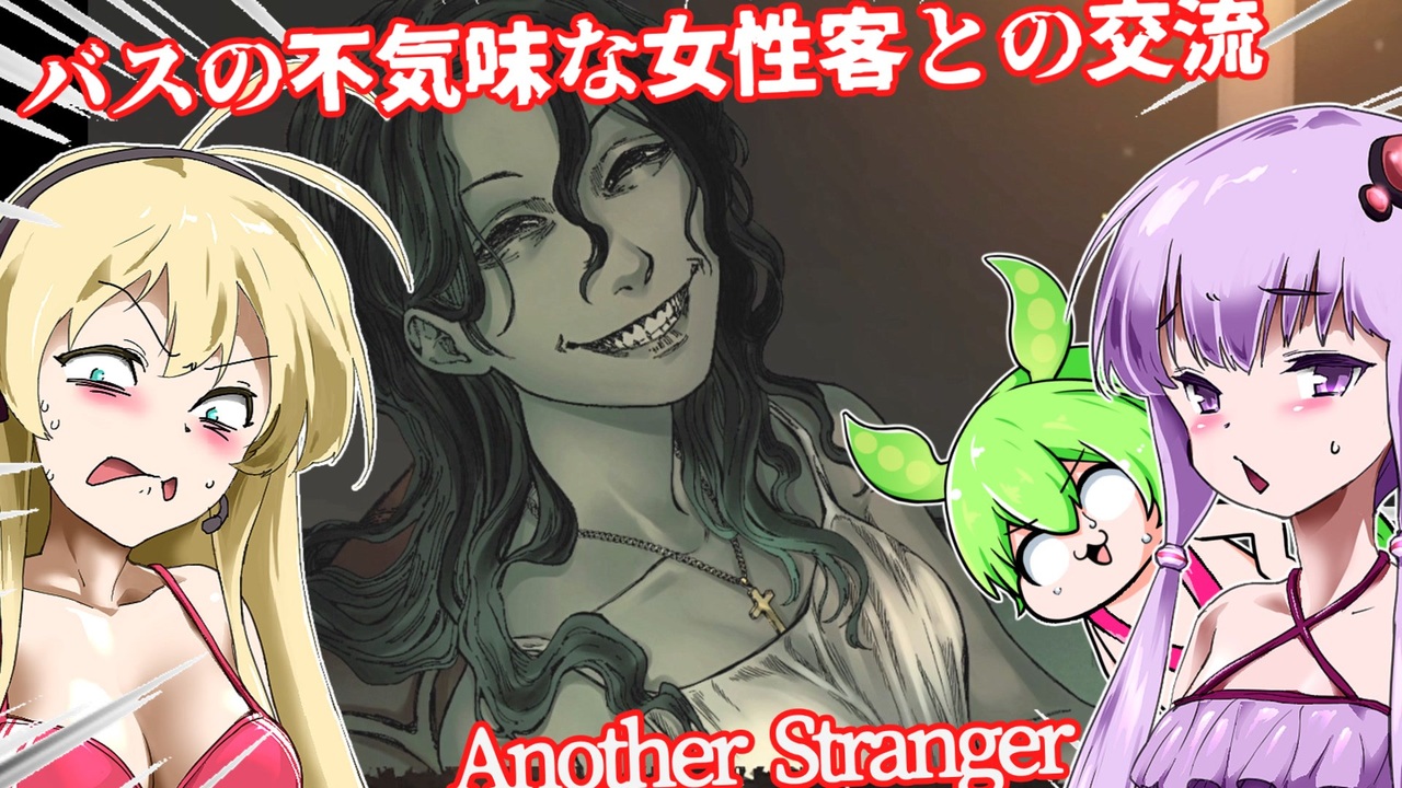 結月ゆかりさん、ずんだもん、弦巻マキちゃんが、海外のホラーアドベンチャーゲームに挑むようです。<br><br>◎あらすじ◎<br>バスに乗り込んだ主人公はいつしか眠り込んでいた。<br>気が付くと隣には何やら様子のおかしな女性客が一人。<br>主人公と女性客の奇妙な交流が始まる。<br><br>※投稿者のガバ翻訳付きです。<br>配信ページ 日本語非対応<br><a href="https://688199.itch.io/another-stranger" target="_blank" rel="noopener nofollow">https://688199.itch.io/another-stranger</a><br><br>VOICEVOX:ずんだもん<br><a href="https://voicevox.hiroshiba.jp/" target="_blank" rel="noopener nofollow">https://voicevox.hiroshiba.jp/</a><br><br>COEIROINK:ワカナ<br>COEIROINK:松嘩りすく<br><a href="https://coeiroink.com/" target="_blank" rel="noopener nofollow">https://coeiroink.com/</a><br><br>BGMをお借りしました。<br><a href="https://otologic.jp/" target="_blank" rel="noopener nofollow">https://otologic.jp/</a><br>深海たこくじら<br><a href="http://syakeyogari.blog.fc2.com/blog-entry-7.html" target="_blank" rel="noopener nofollow">http://syakeyogari.blog.fc2.com/blog-entry-7.html</a><br><br>立ち絵をお借りしました。<br><a href="https://seiga.nicovideo.jp/seiga/im10933652" target="_blank" rel="noopener nofollow">https://seiga.nicovideo.jp/seiga/im10933652</a><br><a href="https://seiga.nicovideo.jp/seiga/im11230837" target="_blank" rel="noopener nofollow">https://seiga.nicovideo.jp/seiga/im11230837</a><br><a href="https://seiga.nicovideo.jp/seiga/im11229020" target="_blank" rel="noopener nofollow">https://seiga.nicovideo.jp/seiga/im11229020</a><br><a href="https://seiga.nicovideo.jp/seiga/im4817713" target="_blank" rel="noopener nofollow">https://seiga.nicovideo.jp/seiga/im4817713</a>