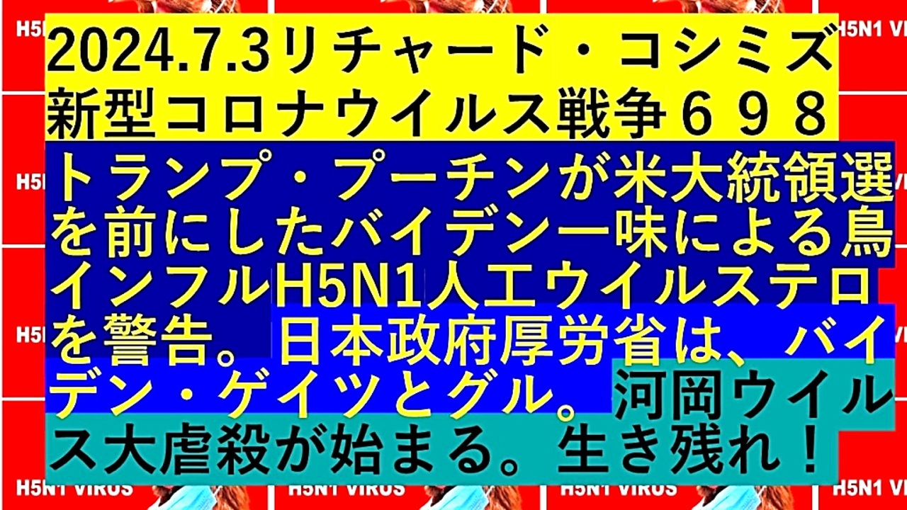 <span style="color: #cc0000;"><strong>◐「 テーマ : 新型コロナウイルス戦争 ⦅ 698 ⦆ 」</strong></span><br><br><span style="color: #ff0000;"><strong>「『 トランプ・プーチン 』が『 米大統領選 』を前にした『 バイデン一味 』による『 鳥インフルエンザ<br> H5N1人工ウイルステロ 』を『 警告 』。<br> 『 日本政府厚労省 』は、『 バイデン・ゲイツ 』と『 グル 』。<br> 『 河岡ウイルス大虐殺 』が『 始まる 』。『 生き残れ! 』」</strong></span><br><br> <span style="color: #38761d;"><strong>◐『 リチャード・コシミズ 書籍 :「 2024年 鳥インフルH5N1バイオテロを生き抜くために 」』</strong></span><br><span style="color: #0000ff;"><strong> <a href="https://x.gd/AG1bf" target="_blank" rel="noopener nofollow">https://x.gd/AG1bf</a></strong></span><br><br> <span style="color: #38761d;"><strong>◐ 『 リチャード・コシミズ・チャンネル⦅ ニコニコ チャンネル ⦆』</strong></span><br><span style="color: #0000ff;"><strong> <a href="https://ch.nicovideo.jp/richardkoshimizu" target="_blank" rel="noopener nofollow">https://ch.nicovideo.jp/richardkoshimizu</a></strong></span><br><br><span style="color: #38761d;"><strong> ◐ 『 リチャード・コシミズ ニコニコ生放送⦅ LIVE ⦆』</strong></span><br><span style="color: #0000ff;"><strong> <a href="https://www.nicovideo.jp/user/120930363/live_programs" target="_blank" rel="noopener nofollow">https://www.nicovideo.jp/user/120930363/live_programs</a></strong></span><br><br> <span style="color: #38761d;"><strong>◐ 『 リチャード・コシミズ「 Rumble 」公式 動画ギャラリー 』</strong></span><br><span style="color: #0000ff;"><strong> <a href="https://rumble.com/user/richardkoshimizu" target="_blank" rel="noopener nofollow">https://rumble.com/user/richardkoshimizu</a></strong></span><br><br>