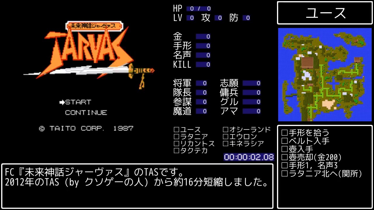 クソゲーの人のTAS (<a href="https://www.nicovideo.jp/watch/sm16776283" class="watch">sm16776283</a>) から約16分短縮しました。<br>惜しくも1時間は切れませんでした。<br><br>RTA動画 (<a href="https://www.nicovideo.jp/watch/sm39042004" class="watch">sm39042004</a>) の解説も参考にしています。<br><br>part2: <a href="https://www.nicovideo.jp/watch/sm44004001" class="watch">sm44004001</a><br><br>frames: 224458<br>movie: <a href="https://tasvideos.org/UserFiles/Info/638596894564787259" target="_blank" rel="noopener nofollow">https://tasvideos.org/UserFiles/Info/638596894564787259</a><br><br>解析資料: <a href="https://taotao54321.github.io/JarvasResource/" target="_blank" rel="noopener nofollow">https://taotao54321.github.io/JarvasResource/</a><br>兵力バグ詳細: <a href="https://taotao54321.github.io/blog/nes-jarvas-force-glitch/" target="_blank" rel="noopener nofollow">https://taotao54321.github.io/blog/nes-jarvas-force-glitch/</a><br><br>動画編集に苦戦したためエンコがわずかにおかしいかもしれません(小声)<br>ムービーファイル上げてるからゆるして<br>