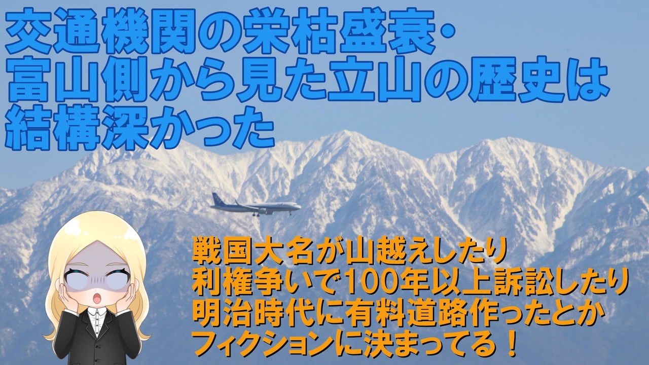 この話は続き物です。第一話がまだの方はこちらからどうぞ→<a href="https://www.nicovideo.jp/watch/sm43908236" class="watch">sm43908236</a><br><br>第2話は富山県側から見た立山の歴史と、アルペンルート建設前史をご紹介します。古来より富山県民に取って心のより所であり、有形無形の恵みを生み出した立山。その歴史的経緯を考えると、立山の玄関口を長野県に取られることは絶対に許容できませんでした。詳しくは本編で。<br><br>第3話→<a href="https://www.nicovideo.jp/watch/sm44283858" class="watch">sm44283858</a><br /><span style="color: #000000; font-size: 14px;">迷航空会社列伝</span><span style="color: #006699; font-size: 14px;"><a href="https://www.nicovideo.jp/mylist/24098760" target="_blank" rel="noopener">mylist/24098760</a></span><span style="color: #000000; font-size: 14px;"> 迷列車北陸編</span><span style="color: #006699; font-size: 14px;"><a href="https://www.nicovideo.jp/mylist/19084652" target="_blank" rel="noopener">mylist/19084652</a> </span><span style="color: #000000; font-size: 14px;">東海道交通戦争</span><span style="color: #006699; font-size: 14px;"><a href="https://www.nicovideo.jp/mylist/57958388" target="_blank" rel="noopener">mylist/57958388</a></span><span style="color: #000000; font-size: 14px;"> 交通機関の栄枯盛衰 </span><a href="https://www.nicovideo.jp/mylist/66898301" target="_blank" rel="noopener">mylist/66898301</a><br><span style="color: #000000; font-size: 14px;">ブログ→</span><span style="color: #006699; font-size: 14px;"><a href="http://www.meihokuriku-alps.com" target="_blank" rel="noopener nofollow">http://www.meihokuriku-alps.com</a></span><br>note→<a href="https://note.com/meihokuriku" target="_blank" rel="noopener nofollow">https://note.com/meihokuriku</a><br><span style="color: #000000; font-size: 14px;">使用BGM<br>甘茶の音楽工房様 </span><span style="color: #006699; font-size: 14px;"><a href="http://amachamusic.chagasi.com/index.html" target="_blank" rel="noopener nofollow">http://amachamusic.chagasi.com/index.html</a></span><br><span style="color: #000000; font-size: 14px;">魔王魂様 </span><span style="color: #006699; font-size: 14px;"><a href="https://maoudamashii.jokersounds.com/list/bgm5.html" target="_blank" rel="noopener nofollow">https://maoudamashii.jokersounds.com/list/bgm5.html</a></span>
