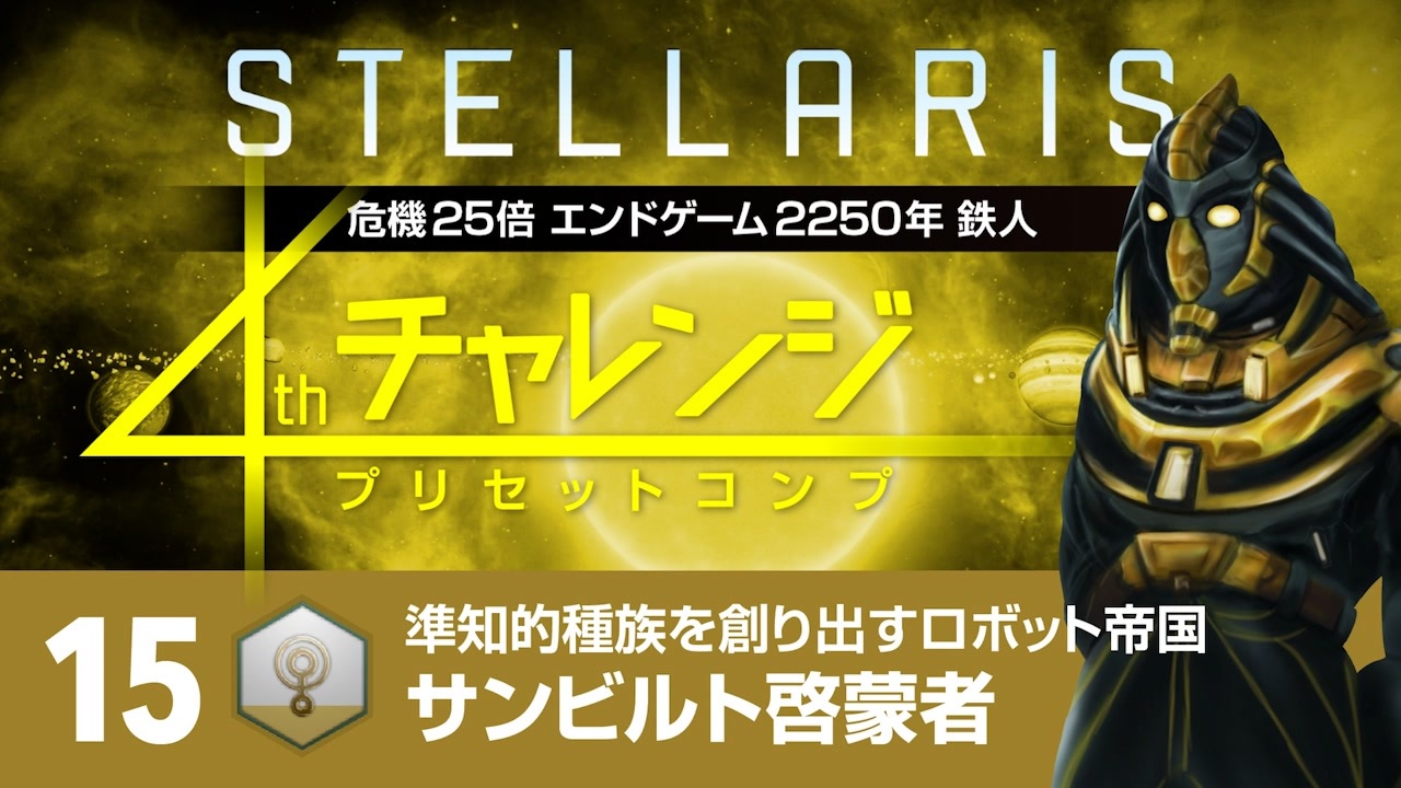 プリセット帝国で危機25倍エンドゲーム2250年鉄人モードに挑むシリーズのハイライト編集版です。<br>「いいね」にこのプリセット帝国のおすすめ度を入れています。<br>※YouTubeに投稿した動画のアップデータ版です。アンケートを残していますが次の帝国はクリア済みです。ご了承ください。<br><br>☆参考動画<br>【Stellaris1分動画祭】Stellarisで最も影が薄い(?)プリセット帝国 - 古郡 さん<br><a href="https://www.nicovideo.jp/watch/sm43667920" target="_blank" rel="noopener nofollow">https://www.nicovideo.jp/watch/sm43667920</a><br><br>☆無編集版<br><a href="https://www.youtube.com/playlist?list=PLKTCcuX4WBFn_Bhls4rrXOVe9hJt-y1g2" target="_blank" rel="noopener nofollow">https://www.youtube.com/playlist?list=PLKTCcuX4WBFn_Bhls4rrXOVe9hJt-y1g2</a><br><br>☆チャレンジの詳細(予告編)<br><a href="https://www.nicovideo.jp/watch/sm39832845" class="watch">sm39832845</a><br><br>☆ゲーム<br>・Stellaris v3.12.4〜5<br><br>☆設定<br>・危機25倍<br>・ミッドゲーム2225年<br>・エンドゲーム2250年<br>・難易度 元帥<br>・鉄人モード<br>・その他はデフォルト<br><br>☆DLC<br>・The Machine Ageまで全部<br><br>☆MOD<br>・Full Tiny Outliner<br>・Improved Topbar - Extended<br>・Tech Tiers Revealed<br><br>☆ナレーション<br>四国めたん(VOICEVOX)<br /><br><span style="color: #262626;">1stチャレンジ(国際地球連合編)⇒ </span><span style="color: #0000ff;"><a href="https://www.nicovideo.jp/series/157544" target="_blank" rel="noopener">series/157544</a></span><br><span style="color: #262626;">2ndチャレンジ(人類共同体編)⇒ </span><span style="color: #0000ff;"><a href="https://www.nicovideo.jp/series/182469" target="_blank" rel="noopener">series/182469</a></span><br><span style="color: #262626;">3rdチャレンジ(ロク機械主義国編)⇒ </span><span style="color: #0000ff;"><a href="https://www.nicovideo.jp/series/207056" target="_blank" rel="noopener">series/207056</a></span><br><span style="color: #262626;">4thチャレンジ(プリセットコンプ)⇒ </span><span style="color: #0000ff;"><a href="https://www.nicovideo.jp/series/287612" target="_blank" rel="noopener">series/287612</a></span><br><span style="color: #262626;">Stellarisマルチプレイ ⇒ </span><span style="color: #0000ff;"><a href="https://www.nicovideo.jp/series/367123" target="_blank" rel="noopener">series/367123</a></span><br><span style="color: #262626;">Stellaris検証動画 ⇒ </span><span style="color: #0000ff;"><a href="https://www.nicovideo.jp/series/202576" target="_blank" rel="noopener">series/202576</a></span><br><span style="color: #262626;">Stellaris妄想動画 ⇒ </span><span style="color: #0000ff;"><a href="https://www.nicovideo.jp/series/310298" target="_blank" rel="noopener">series/310298</a></span><br>Stellaris1分動画祭 ⇒ <a href="https://www.nicovideo.jp/series/404730" target="_blank" rel="noopener">series/404730</a><br><br><br><a target="_blank" href="https://qa.nicovideo.jp/faq/show/19424?site_domain=default" style="font-size: 13px;color: #657586; text-decoration: underline; line-height: 1.4">この動画は投稿者によって修正されました</a>