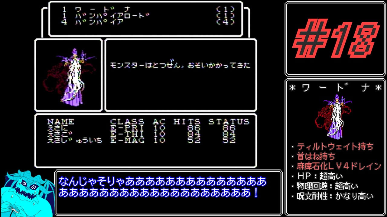 ウソみたいだろ。動くんだぜ。それデ…<br><br>ファミコン版ウィザードリィを三人パーティ&ゆるめに縛ってプレイします。<br><br>*迷宮ルール*<br>1.三人組の冒険者パーティを作ってよい(迷宮内で全滅した者は人数に含めない)<br>2.メンバーに欠員が生じた場合のみ、仲間を募集してよい<br>3.ゲームをはじめからやり直すなら、冒険者を削除してもよい<br>4.冒険の中断を使った事がないパーティだけが地上に帰還する行為を許される<br>5.宝箱を見つけた場合、立ち去らなければどのように扱ってもよい<br>6.善悪混合パーティは、地下一階より下で出現する敵に自ら勝負を挑んでもよい<br>7.迷宮外に限り、何人でも自由にパーティを組んでよい<br>8.不幸な事故があった場合、絶対にリセットボタンは押さなくてよい<br><br>Part1→<a href="https://www.nicovideo.jp/watch/sm43517203" class="watch">sm43517203</a><br><br>Part17→<a href="https://www.nicovideo.jp/watch/sm43980252" class="watch">sm43980252</a><br>Part19(最終回)→<a href="https://www.nicovideo.jp/watch/sm44009383" class="watch">sm44009383</a><br><br>無修正(配信)版:<a href="https://www.twitch.tv/videos/2123984170" target="_blank" rel="noopener nofollow">https://www.twitch.tv/videos/2123984170</a> (決戦は03:42:49頃)<br>R/T/A動画:<a href="https://www.nicovideo.jp/mylist/72204350" target="_blank" rel="noopener">mylist/72204350</a><br /><br><u>****宣伝領域****</u><br><span style="color: #9900ff;">◯Twitch:たまにゆっくり音声で配信してます。見てネ!</span><br>→ <a href="https://www.twitch.tv/chari_demon" target="_blank" rel="noopener nofollow">https://www.twitch.tv/chari_demon</a><br><span style="color: #0000ff;">◯Twitter:たまに役に立たないことをつぶやく場所。見なくてイイです!</span><br>→ <a href="https://twitter.com/MatChariot" target="_blank" rel="noopener nofollow">https://twitter.com/MatChariot</a>