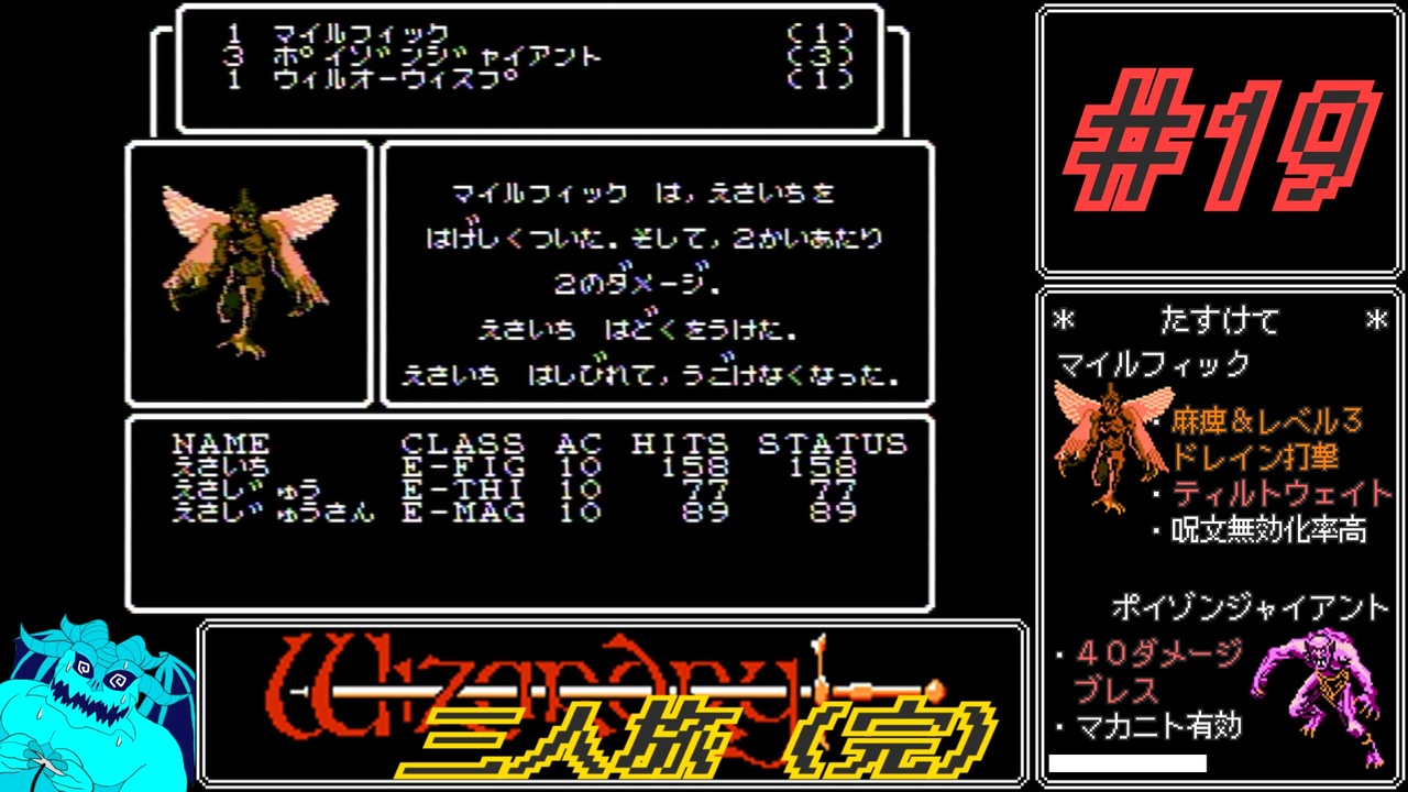 最終回です。完結です。果たしてラスボスまでたどり着けるのでしょうか(不安)<br><br>ファミコン版ウィザードリィを三人パーティ&ゆるめに縛ってプレイします。<br><br>*迷宮ルール*<br>1.三人組の冒険者パーティを作ってよい(迷宮内で全滅した者は人数に含めない)<br>2.メンバーに欠員が生じた場合のみ、仲間を募集してよい<br>3.ゲームをはじめからやり直すなら、冒険者を削除してもよい<br>4.冒険の中断を使った事がないパーティだけが地上に帰還する行為を許される<br>5.宝箱を見つけた場合、立ち去らなければどのように扱ってもよい<br>6.善悪混合パーティは、地下一階より下で出現する敵に自ら勝負を挑んでもよい<br>7.迷宮外に限り、何人でも自由にパーティを組んでよい<br>8.不幸な事故があった場合、絶対にリセットボタンは押さなくてよい<br><br>Part1→<a href="https://www.nicovideo.jp/watch/sm43517203" class="watch">sm43517203</a><br>Part18→<a href="https://www.nicovideo.jp/watch/sm44009180" class="watch">sm44009180</a><br><br>無修正版(修行):<a href="https://www.twitch.tv/videos/2125661963" target="_blank" rel="noopener nofollow">https://www.twitch.tv/videos/2125661963</a><br>無修正版(決戦):<a href="https://www.twitch.tv/videos/2125814101" target="_blank" rel="noopener nofollow">https://www.twitch.tv/videos/2125814101</a><br>無修正版(蛇足):<a href="https://www.twitch.tv/videos/2127487074" target="_blank" rel="noopener nofollow">https://www.twitch.tv/videos/2127487074</a><br>R/T/A動画:<a href="https://www.nicovideo.jp/mylist/72204350" target="_blank" rel="noopener">mylist/72204350</a><br /><br><u>****宣伝領域****</u><br><span style="color: #9900ff;">◯Twitch:たまにゆっくり音声で配信してます。見てネ!</span><br>→ <a href="https://www.twitch.tv/chari_demon" target="_blank" rel="noopener nofollow">https://www.twitch.tv/chari_demon</a><br><span style="color: #0000ff;">◯Twitter:たまに役に立たないことをつぶやく場所。見なくてイイです!</span><br>→ <a href="https://twitter.com/MatChariot" target="_blank" rel="noopener nofollow">https://twitter.com/MatChariot</a>
