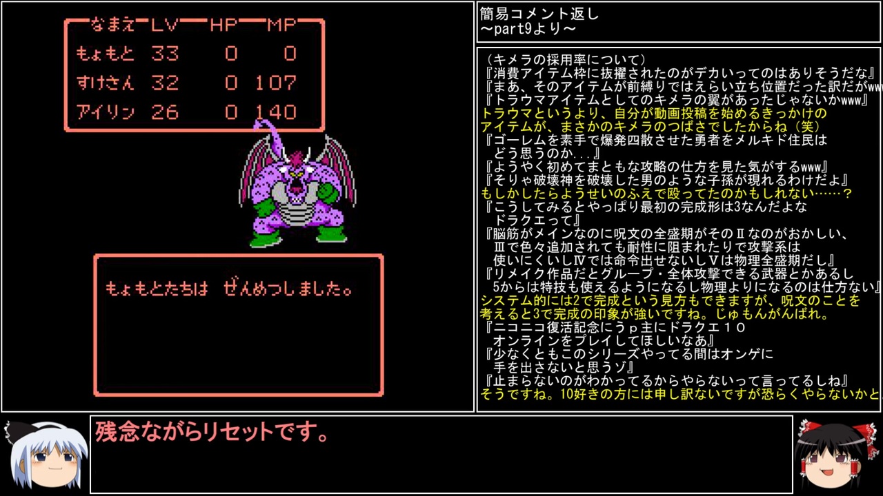 DQⅡの1周目、FCDQⅡ編part7です。 <br>難易度が高いことで有名なDQⅡ。最後に待ち受けるのはイベントやマップを知っていようと関係ない、理不尽なパワーが襲い掛かってきます。<br><br>前→<a href="https://www.nicovideo.jp/watch/sm43973342" class="watch">sm43973342</a><br>次→<a href="https://www.nicovideo.jp/watch/sm44052594" class="watch">sm44052594</a><br><br>YouTube版→<a href="https://youtu.be/0cyirJ400PQ" target="_blank" rel="noopener nofollow">https://youtu.be/0cyirJ400PQ</a><br><br>縛りルール(詳細はpart1参照)<br>①一度使った武器・防具・装飾品・道具・呪文・特技は<br> 次作品以降使用禁止。(売却も解禁扱い)<br><br> 一度使った職業(3,6,7)・仲間モンスター(5,6)・スカウトモンスター(8)は<br> 戦士(Ⅲ)、戦士(Ⅵ)のようにナンバリングで分類し次作品以降使用禁止。<br> また複数体加入できる仲間モンスターは一体まで。<br><br>②裏技、バグ技、全滅、逃走、おどかす禁止。<br> またダンジョン攻略とボス戦における状況再現禁止。<br><br>③ダンジョンとボス攻略は、全キャラのレベルを突入時、<br> 1周目は目標レベル+5。2周目は+10。3周目は+15まで。<br> ラスボスの目標レベルは45。裏ボスは50とする。<br>(目標レベルは各公式ガイドブックを参照)<br><br>④1周目はEDまで。2周目は裏ボス撃破まで。<br> 3周目は全てのボスを規定回数、規定ターン以内に倒す。<br>(回避可能なボスも倒し、闇ゾーマは3周全てで倒す)<br><br><br><span style="color: #262626;">※一部機種は互換機を使用してのプレイとなりますが、倍速機能やクイックセーブ・ロード、チートなどは一切使用しません。</span><br><br>※ネタバレ注意です<br><br>この動画で利用している株式会社スクウェア・エニックスを代表とする共同著作者が権利を所有する著作物及びスギヤマ工房有限会社が権利を所有する楽曲の転載・配布は禁止いたします。<br>(C) ARMOR PROJECT/BIRD STUDIO/SQUARE ENIX All Rights Reserved.<br>(C) SUGIYAMA KOBO (P) SUGIYAMA KOBO<br><br>AquesTalk2ライセンスID:AQTK2WINUSR23122185<br /><br><br>❤いいねを押していただけるとモチベーションと投稿速度が上がるので宜しくお願い致します!<br><br>作者ツイッター→ <a href="https://twitter.com/nig0117" target="_blank" rel="noopener nofollow">https://twitter.com/nig0117</a><br>PIXIV FANBOX→ <a href="https://sutanokeiji.fanbox.cc/" target="_blank" rel="noopener nofollow">https://sutanokeiji.fanbox.cc/</a><br><br>( 以前はWEB小説書いてました→ <a href="https://kakuyomu.jp/works/1177354054884910267" target="_blank" rel="noopener nofollow">https://kakuyomu.jp/works/1177354054884910267</a> )