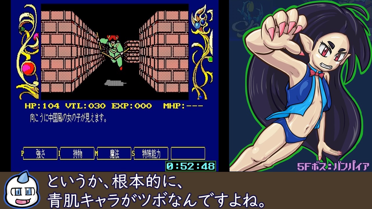 MSX2版『カオスエンジェルズ』のRTAです。<br><br>よしよし、前Partも規制はされてないな。<br>ニコ動ならOKで、つべやビリに転載したらBANされるくらいのチョウドイイ所を狙っていきたい。<br>(冗談です。自重しますので怒らないで)<br><br>ーーーーー<br>『カオスエンジェルズ』Copyright (C) 1988 アスキー, KADOKAWA<br>『MSXPLAYer』Copyright (C) 2000-2005 MSX Association <br>ーーーーー<br><br>【プレイ環境】<br> <使用ソフト><br> MSXマガジン永久保存版3 収録版<br> 『MSX2版 カオスエンジェルズ』<br> 『MSXPLAYer 2005.0.11.5.44』<br> <MSXPLAYer設定><br> フレームレート:高<br> エミュレーション速度:標準(x1)<br> 画面表示:ウィンドウ<br><br>【レギュレーション】<br> ・Any%クリア<br> ・計測開始:OP後 DISK-Bを入れ、キー入力した瞬間<br> ・計測終了:ラスボス勝利後 DISK-Aを入れ、キー入力した瞬間<br><br><br>※『カオスエンジェルス』の権利について、<br>権利元のアスキー社はすでに存在しないため、その事業を吸収したKADOKAWAが権利を継承したものと推定して記載しております。<br>該当の記載について、誤りがございましたらコメントにてご指摘下さると幸いです(正しい情報のソースを頂けると助かります)。