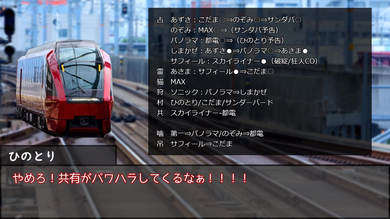 旅行先の静岡でチマチマ動画編集を進めていました。<br>今日は宇都宮ライトレール開業1周年記念!<br>写真コンテストに応募したけど、どうなるかな~<br><br>14C猫FO:村1/占2/霊1/狩1/猫1/共2/狼3/狂2/狐1<br><br>2日目:<a href="https://www.nicovideo.jp/watch/sm43874250" class="watch">sm43874250</a> <br>3日目:<a href="https://www.nicovideo.jp/watch/sm43955947" class="watch">sm43955947</a> 5日目:<a href="https://www.nicovideo.jp/watch/sm44059550" class="watch">sm44059550</a><br><br>Twitterで考察して頂ける方は『#電車で人狼』を入れて呟いていただけると探しやすいです。<br>擬人化関連のFAは『#鉄擬で人狼』を入れて頂けると助かります。<br>(既に投稿されたものはそのままで大丈夫ですよ!)<br><br>電車で人狼!マイリスト <a href="https://www.nicovideo.jp/mylist/72946958" target="_blank" rel="noopener">mylist/72946958</a><br>電車で人狼! 支線編(解説動画) <a href="https://www.nicovideo.jp/mylist/79077747" target="_blank" rel="noopener">mylist/79077747</a><br>人狼動物園マイリスト <a href="https://www.nicovideo.jp/mylist/72986089" target="_blank" rel="noopener">mylist/72986089</a><br><br><a target="_blank" href="https://qa.nicovideo.jp/faq/show/19424?site_domain=default" style="font-size: 13px;color: #657586; text-decoration: underline; line-height: 1.4">この動画は投稿者によって修正されました</a>