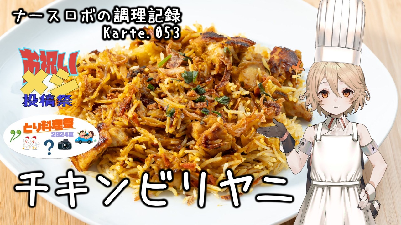 Part53はチキンビリヤニ!いつかのビリヤニ動画のリベンジです。<br>1人前から作りやすいようにKALDI バスマティライスを使います。<br>スパイスの効いた、複雑な香りが楽しいお料理です。<br>スパイスカレーが好きな人はぜひ作ってみてくださいね。<br><br>本動画は ちきんすてーき様主催の「とり料理祭2024夏」に参加しています。<br>告知動画: <a href="https://www.nicovideo.jp/watch/sm43578188" class="watch">sm43578188</a><br><br>本動画は なめろう様主催の「お祝いメシ投稿祭」に参加しています。<br>告知動画: <a href="https://www.nicovideo.jp/watch/sm43367312" class="watch">sm43367312</a><br><br>以前作ったビリヤニはこちら。<br>→<a href="https://www.nicovideo.jp/watch/sm42778021" class="watch">sm42778021</a><br>→<a href="https://youtu.be/ZJpkCzAbZ6M" target="_blank" rel="noopener nofollow">https://youtu.be/ZJpkCzAbZ6M</a><br><br>音声: VOICEVOX:ナースロボ_タイプT<br>立ち絵: 捨て犬A<br>イラスト: いらすとや<br>SE: otologic, 効果音ラボ<br>BGM: BGMer<br /><br>[各種リンク]<br>ニコニコ動画: <a href="http://nicovideo.jp/user/130153578" target="_blank" rel="noopener nofollow">http://nicovideo.jp/user/130153578</a><br>YouTubeメイン(料理): <a href="http://youtube.com/@cooking25euph" target="_blank" rel="noopener nofollow">http://youtube.com/@cooking25euph</a><br>YouTubeサブ(料理以外): <a href="https://youtube.com/@sub25euph" target="_blank" rel="noopener nofollow">https://youtube.com/@sub25euph</a><br>X (twitter): <a href="https://twitter.com/nico25euph" target="_blank" rel="noopener nofollow">https://twitter.com/nico25euph</a><br>Bluesky: <a href="http://nico25euph.bsky.social" target="_blank" rel="noopener nofollow">http://nico25euph.bsky.social</a><br>TikTok: <a href="http://tiktok.com/@nico25euph" target="_blank" rel="noopener nofollow">http://tiktok.com/@nico25euph</a>