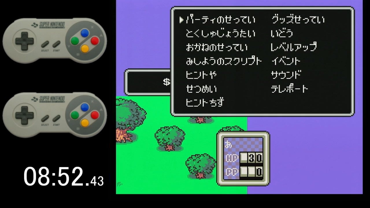 もはやオネット以外の町すら出てこない<br><br>タイマースタート:名前付けの後の"はい"を選択<br>タイマーストップ:"TO BE CONTINUED.."が表示<br><br>使用ハード:スーパーファミコン<br>1Pコントローラー:スーパーファミコン用コントローラー(十字ボタンなし)<br>2Pコントローラー:アスキーパッド<br><br>無編集版<br><a href="https://youtu.be/SKdnJwJP_Ec?si=Cp-cTv4sBA0RYBh2" target="_blank" rel="noopener nofollow">https://youtu.be/SKdnJwJP_Ec?si=Cp-cTv4sBA0RYBh2</a><br><br>EarthBoundのこのカテゴリの自己ベスト(2024/8/27時点)<br><a href="https://youtu.be/V-0nno9nHPo?si=iVoZ80ytwSaO9DMt" target="_blank" rel="noopener nofollow">https://youtu.be/V-0nno9nHPo?si=iVoZ80ytwSaO9DMt</a><br><br>参考記事<br><a href="https://web.archive.org/web/20201106233411/https://ch.nicovideo.jp/nou/blomaga/ar356566" target="_blank" rel="noopener nofollow">https://web.archive.org/web/20201106233411/https://ch.nicovideo.jp/nou/blomaga/ar356566</a><br><br>RTAのランキング<br><a href="https://www.speedrun.com/earthbound?h=Any_Debug_Menu-Mother_2&x=wk61g4rd-0nwkd9kn.8147d501" target="_blank" rel="noopener nofollow">https://www.speedrun.com/earthbound?h=Any_Debug_Menu-Mother_2&x=wk61g4rd-0nwkd9kn.8147d501</a><br><br>他の解説動画<br><a href="https://www.nicovideo.jp/mylist/64228087" target="_blank" rel="noopener">mylist/64228087</a>