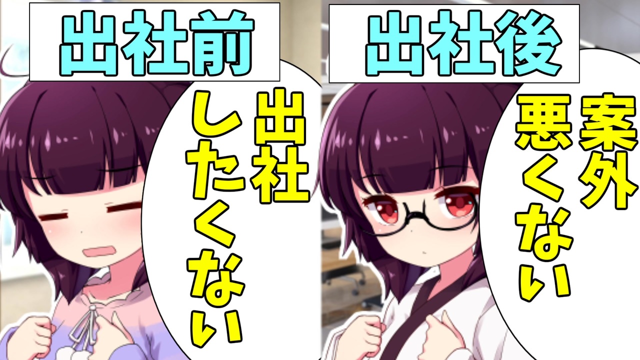 皆さんはテレワークされていますか?<br><br>コロナ禍に多く広まったテレワーク、定着した企業もあれば<br>非効率と判断され、テレワークを取りやめて出社して業務するスタイルに戻した企業もあると聞きます<br>この動画はコロナ禍での出勤規制が緩みつつあった2023年10月に制作したものです<br>その頃は私の職場では基本的にほぼ毎日テレワークで、数か月に1回なにか用があれば特別に出社するとなっていました<br>出社しなくてはならないときの出社前の億劫さや出社した後に感じたことをもとに動画化してみました<br><br>いいねコメント参考<br>国土交通省 令和5年度 テレワーク人口実態調査 -調査結果(概要) -<br><a href="https://www.mlit.go.jp/report/press/content/001733057.pdf" target="_blank" rel="noopener nofollow">https://www.mlit.go.jp/report/press/content/001733057.pdf</a><br><br><span style="font-size: 10px;">◆音声合成トークソフト<br>VOICEROID+:東北きりたん<br>VOICEROID+:東北ずん子<br>VOICEROID+:京町セイカ<br>VOICEROID2:結月ゆかり<br>◆立ち絵<br>blueberry さん / 東北きりたん【キャラ素材】<br>blueberry さん / 【精華町公式】京町セイカ素材<br>MtU さん / 東北ずん子さん立ち絵素材ver2.0<br>MtU さん / サウナゆかりさん立ち絵素材<br>◆BGM<br>DOVA-SYNDROME さん / 「garden」 written by 稿屋 隆 / 「わくわくクッキングタイム的なBGM」 written by 鷹尾まさき(タカオマサキ) / 「カフェでひと休み」 written by しんさんわーくす / 「クレイジークッキング」 written by 稿屋 隆<br>◆画像<br>イラストAC さん / ポテトチップス うす塩 / 焼き鮭の和定食 / 炭酸飲料<br>写真AC さん / オフィス9 / オフィスビルの廊下 / 街並み / 食券券売機 / 誰もいない食堂の座席<br>フキダシデザイン さん / シンプルなふきだしなフキダシ12<br>Yukimi` さん / ヒロインの自室風部屋<br>◆効果音<br>OtoLogic さん / PC キーボード02 / PC マウス03<br>効果音ラボ さん / 決定、ボタン押下22 / きらーん / ニュッ2 / パッ / 間抜け3 / 間抜け4 / 小パンチ / 決定、ボタン押下52<br>◆GB素材<br>ガッkoya さん / 【スマホ版準拠】もっとわかりやすい「いいね!」アニメーション / 【PC版準拠】もっとわかりやすい「いいね!」アニメーション</span><br />***<span style="font-size: 10px;">共通メッセージ 最終更新2024/12/31</span><br><span style="color: #ff9900;"><strong>★今後の投稿予定のご案内(変更の可能性があります)</strong></span><br>定期的に投稿する予定ですので、よろしければフォローよろしくお願いします<br><br><span style="font-size: 10px;">現在のストック一覧</span><br><span style="font-size: 10px;"><u>メインシリーズ(7) 3か月に1本ずつ公開予定です</u></span><br><span style="font-size: 10px;">・サービス残業をする理由解説<br>・会社辞める人あるある<br>・短所を長所に置き換え リフレーミング解説<br>・クソ会議あるある<br>・職場の働き方改革あるある<br>・職場の喫煙事情あるある<br>・職場のeラーニングあるある</span>