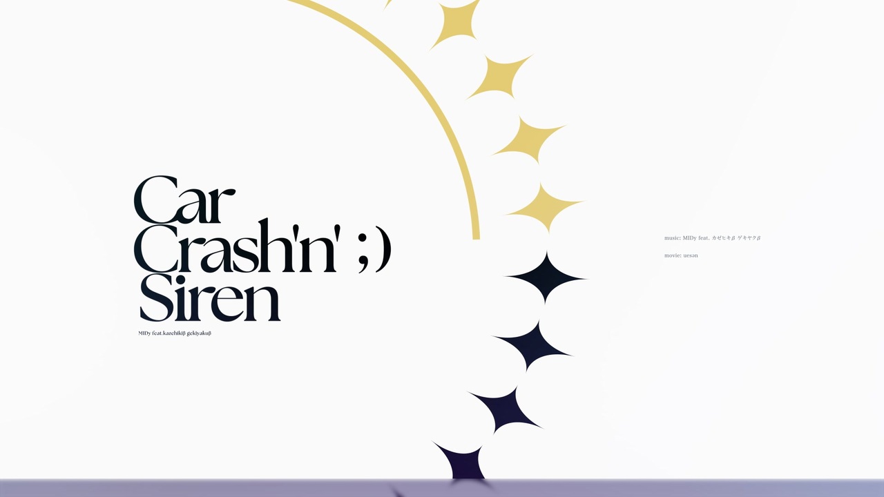 Please comment " CCS ;) "<br><br>music : MIDy<br><a href="https://twitter.com/midy9969nect" target="_blank" rel="noopener nofollow">https://twitter.com/midy9969nect</a><br><br>movie : uesən<br><a href="https://twitter.com/testtesttestts5" target="_blank" rel="noopener nofollow">https://twitter.com/testtesttestts5</a><br><br>vocal : カゼヒキβ ゲキヤクβ<br>VOCALOID β-STUDIO<br><a href="https://vocaloid.beta.yamaha.com/" target="_blank" rel="noopener nofollow">https://vocaloid.beta.yamaha.com/</a><br><br>---<br><br>Lost Frog Productions 主催<br>Hyperflipコンピレーションアルバム<br>「CAR CRASH AND SIREN」収録曲<br><br>Bandcamp<br><a href="https://lostfrog.bandcamp.com/album/car-crash-and-siren" target="_blank" rel="noopener nofollow">https://lostfrog.bandcamp.com/album/car-crash-and-siren</a><br><br>Lost Frog Productions<br><a href="https://twitter.com/lostfrognet" target="_blank" rel="noopener nofollow">https://twitter.com/lostfrognet</a><br><br>---<br><br>lyric<br><br>音の雲の上 聴いたことある<br>だけどノイズだらけの音楽<br>耳鳴りの果てに 見えた光景<br>轢き殺して 聴いて 叫んで<br>CarCrash'n'Siren<br><br>ツギハギのノスタルジーで<br>喜怒哀楽をぶち壊して<br>刺激しかない音で<br>君の中に刻みつけて<br><br>仮想だけの経験で<br>音楽はいつも<br>耳元でなっている<br>細い線だけで繋がってる<br>インターネットでみんなで渡る赤信号が<br>勝手に開くタブを閉じた先で<br>待っているから<br>CarCrash'n'Siren<br><br>音の雲の上 聴いたことある<br>だけどノイズだらけの音楽<br>耳鳴りの果てに 見えた光景<br>轢き殺して 聴いて 叫んで<br>CarCrash'n'Siren