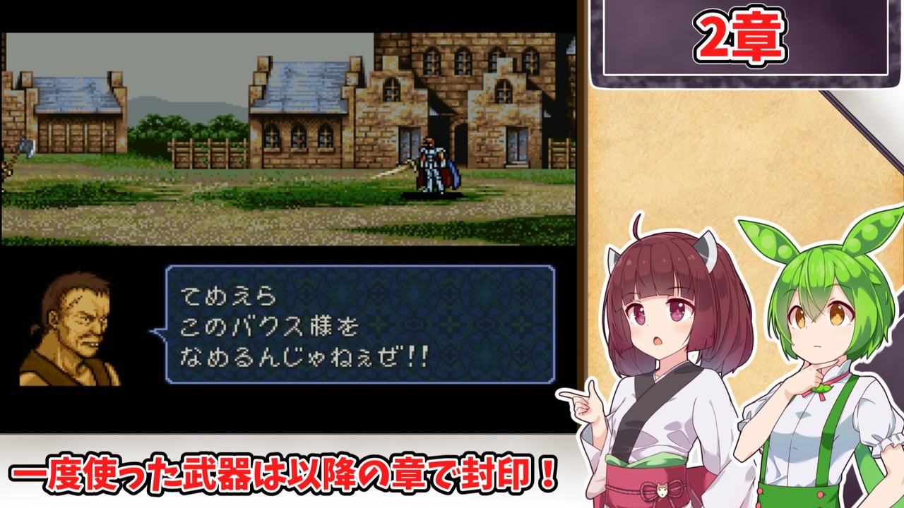 <span style="color: #85200c; font-size: 24px;"><strong><i>2章で出す敵の強さとは思えねぇです…</i></strong></span><br><br><br><span style="font-size: 16px;"><strong>1:一度使用した武器種は、以降の章で使用する事を禁止する。<br>2:武器の使用の定義は『その武器を装備した状態で敵との戦闘が発生したタイミング』<br>または『その武器を使って敵に「捕える」コマンドを実行したタイミング』<br>杖の場合は『対象に対して使用した時点(命中の可否は問わない)』とする。 </strong></span><br><span style="color: #ff0000; font-size: 16px;"><strong>※同盟軍、演出による戦闘イベントでは使用した判定にはならないこととする。</strong></span><span style="font-size: 16px;"><strong> <br>3:仲間を47人生存させ、【外伝】を含む全ての章を攻略し、総合評価でB以上の状態でゲームをクリアする。</strong></span><br><br><br>本動画のシリーズリスト【<a href="https://www.nicovideo.jp/series/482976" target="_blank" rel="noopener">series/482976</a>】<br>『烈火』の同縛りプレイ【<a href="https://www.nicovideo.jp/series/406473" target="_blank" rel="noopener">series/406473</a>】<br>『封印』の同縛りプレイ【<a href="https://www.nicovideo.jp/series/316824" target="_blank" rel="noopener">series/316824</a>】<br>前:【<a href="https://www.nicovideo.jp/watch/sm44007044" class="watch">sm44007044</a>】次:【<a href="https://www.nicovideo.jp/watch/sm44064737" class="watch">sm44064737</a>】<br><br><strong>使用したソフト</strong><br>VOICEROID+東北きりたんEX<br>VOICEVOX:ずんだもん<br>VOICEPEAK ずんだもん<br><strong>お借りした素材</strong><br>ニコニコモンズの皆様(コンテンツツリー参照)