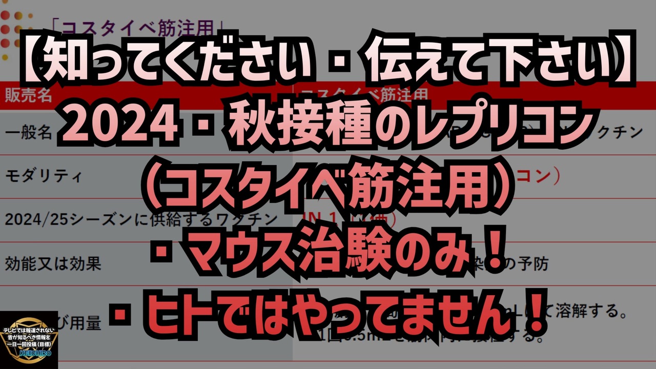 明治のレプリコンは製品名「コスタイベ筋注」は3種類ある。 秋接種 に使うかどうか、と治験時死亡数まとめ↓<br><br>①1価:起源株(ベトナム治験済)<br>→使わない、死亡数レプリコン投与者18人<br>② 2価:起源株&BA4-5(国内治験済)<br>→使わない 、死亡数不明(未承認なので非公表)<br>③1価:JN1(マウスのみ)<br>→使う ヒトの治験やってない<br><br><a href="https://x.com/corowaku_memo/status/1824080406096085248" target="_blank" rel="noopener nofollow">https://x.com/corowaku_memo/status/1824080406096085248</a><br><br><br>健康にアイデアを meiji<br><br>「コスタイベ筋注用」<br><br>販売名<br>コスタイベ筋注用<br>一般名<br>コロナウイルス (SARS-CoV-2) RNAワクチン<br><br>モダリティ<br>mRNAワクチン(レプリコン)<br><br>2024/2025シーズンに供給するワクチン<br>JN.1 (1価)<br><br>効能又は効果<br>SARS-CoV-2による感染症の予防<br><br>用法及び用量<br>・ 本剤を日局生理食塩液10mLにて溶解する。<br>・1回0.5mLを筋肉内に接種する。<br><br><br>8/30、製造承認が下りれば、明治製菓ファルマのレプリコンワクチン(コスタイベ)はこの秋から接種開始です<br><a href="https://x.com/fseiichizb4/status/1829050952348729634?t=5y2fQ6RR60dEaIdMaD574Q&s=19" target="_blank" rel="noopener nofollow">https://x.com/fseiichizb4/status/1829050952348729634?t=5y2fQ6RR60dEaIdMaD574Q&s=19</a><br><br><br>気象衛星ひまわりの画像データだと<br>台風10号の目が<br>本日15時頃熊本上空で<br>無くなったみたいですね<br><br>現地からは19:30頃無風ですってw<br><a href="https://x.com/ttmikrs/status/1829146777003671841?t=QpnVYIJW3Wr1CGWRHZNIUw&s=19" target="_blank" rel="noopener nofollow">https://x.com/ttmikrs/status/1829146777003671841?t=QpnVYIJW3Wr1CGWRHZNIUw&s=19</a><br><br><br>レプリコンワクチン 明治のコロナワクチン コスタイベ筋注用 新型コロナウイルス ワクチン 台風10号<br><br>お米価格高騰 JN1 <br>秋接種のレプリコンワクチン<br>秋接種のレプリコンはマウス治験のみ<br>秋接種のレプリコンはヒトでの治験はしていない<br><br><br />著作権、肖像権に配慮して作成しております。<br><br>◆気になったニュースの台本!?<br>メモ代わりに作った台本をそのままあげてます<br><a href="https://keiichiro8140.hatenablog.com/." target="_blank" rel="noopener nofollow">https://keiichiro8140.hatenablog.com/.</a><br><br><br>ここからはシリーズ紹介<br><br><br>◆ ワクチン解毒・デトックス<br><a href="https://x.gd/fZweg" target="_blank" rel="noopener nofollow">https://x.gd/fZweg</a><br><br>◆ウイリアム・マキス博士のがん治療(イベルメクチン・フェンベンダゾール等)<br><a href="https://x.gd/AtFYS" target="_blank" rel="noopener nofollow">https://x.gd/AtFYS</a><br><br>◆予防接種健康被害救済制度<br><a href="https://x.gd/0xK9x" target="_blank" rel="noopener nofollow">https://x.gd/0xK9x</a><br><br>◆気になったニュース #1501~<br><br>◆ 【ショートver】気になったニュース<br><a href="https://x.gd/7MxXC" target="_blank" rel="noopener nofollow">https://x.gd/7MxXC</a><br><br>◆ 気になったニュース #1001~<br><a href="https://x.gd/Lp8gv" target="_blank" rel="noopener nofollow">https://x.gd/Lp8gv</a><br><br>◆ 気になったニュース #501~<br><a href="https://x.gd/EmbS4" target="_blank" rel="noopener nofollow">https://x.gd/EmbS4</a><br><br>◆ 気になったニュース #1~#500<br><a href="https://x.gd/uPhNb" target="_blank" rel="noopener nofollow">https://x.gd/uPhNb</a><br><br>◆ X(旧Twitter)・テレグラムで気になった情報<br><a href="https://x.gd/YG6FT" target="_blank" rel="noopener nofollow">https://x.gd/YG6FT</a><br><br>◆ 日比谷5万人パレードデ⚪生放送アーカイブ動画<br><a href="https://x.gd/3CHJv" target="_blank" rel="noopener nofollow">https://x.gd/3CHJv</a><br><br>◆日比谷5万人パレード⚪モのマイリスト作ってみました<br><a href="https://nico.ms/mylist/76828848?ref=sp_other" target="_blank" rel="noopener nofollow">https://nico.ms/mylist/76828848?ref=sp_other</a><br><br>◆3.30 令和の百姓⚪⚪<br><a href="https://www.nicovideo.jp/series/511791?ref=garage_share_other" target="_blank" rel="noopener nofollow">https://www.nicovideo.jp/series/511791?ref=garage_share_other</a><br><br>◆ 及川幸久さんの【XNEWS】シリーズ<br><a href="https://x.gd/3k78K" target="_blank" rel="noopener nofollow">https://x.gd/3k78K</a><br><br>◆これまでの動画<a href="https://x.gd/sPXoJ" target="_blank" rel="noopener nofollow">https://x.gd/sPXoJ</a><br><br>◆もしも(BAN)の時のためのマイリンク集<a href="https://lit.link/K-16_News44" target="_blank" rel="noopener nofollow">https://lit.link/K-16_News44</a><br><br>
