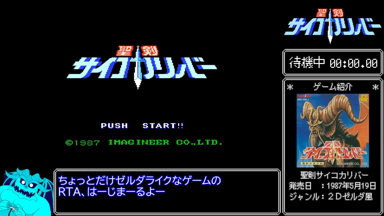 (ディスクシステムのゲームのRTAは)初投稿です。<br>サムネにも映っているマスコットキャラクターがかわいいね。<br><br>~RTAのルール~<br>●計測区間:新規データを選んだ時~ラスボス撃破後の暗転<br>●使用機種:ニューファミコン&ディスクシステム実機<br><br>Part2→<a href="https://www.nicovideo.jp/watch/sm44040106" class="watch">sm44040106</a><br><br>タイマーのみ版:<a href="https://youtu.be/Yv34aphFtrM" target="_blank" rel="noopener nofollow">https://youtu.be/Yv34aphFtrM</a><br>他のRTA動画:<a href="https://www.nicovideo.jp/mylist/72204350" target="_blank" rel="noopener">mylist/72204350</a><br><br><strong>コメ返:<br>・(1面のボスの名前に関して)ヒポグリフじゃなかったっけ?<br>>すみませんそうでした!ずっと間違ったまま覚えてた!!なんで!</strong><br><br /><br><u>****宣伝領域****</u><br><span style="color: #9900ff;">◯Twitch:たまにゆっくり音声で配信してます。見てネ!</span><br>→ <a href="https://www.twitch.tv/chari_demon" target="_blank" rel="noopener nofollow">https://www.twitch.tv/chari_demon</a><br><span style="color: #0000ff;">◯Twitter:たまに役に立たないことをつぶやく場所。見なくてイイです!</span><br>→ <a href="https://twitter.com/MatChariot" target="_blank" rel="noopener nofollow">https://twitter.com/MatChariot</a>